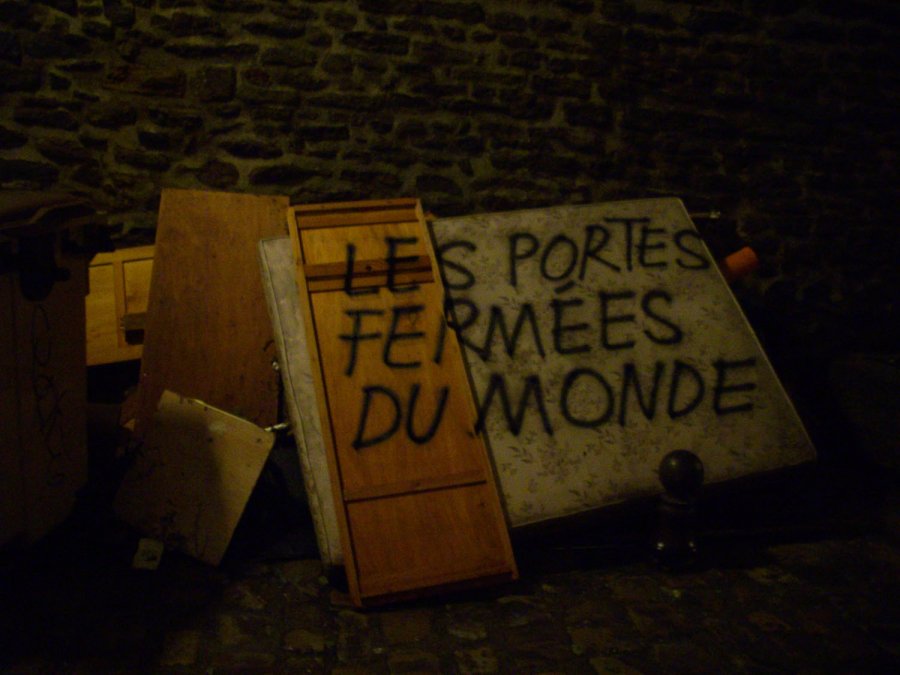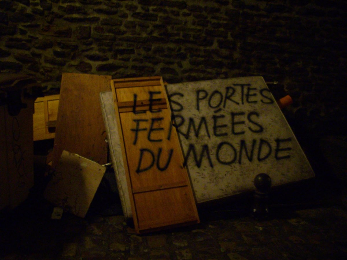 Être là, y pénétrer en franchissant les déblais, énoncer ce qui a lieu, désigner la dislocation comme politique essentielle des pouvoirs. Justin Delareux retrouve ici, relance à vrai dire, le genre de l’exemplum (4) qui, de l’antiquité à Dante et au-delà, témoigne de la présence au monde du poète qui nomme les choses et les lieux, interroge la communauté, les passants : qui a ″fermé les portes du monde″ ? De quel ″spectacle″ désire-t-on que nous soyons asservis ? L’école du savoir devrait-elle ne plus faire sens, être ″finie″ ? Au nom de quoi devrions-nous ne pas ″démissionner″ ? Qui pourrait nous refuser de ″manier″ le réel, de l’ouvrir à notre investigation ? De quoi devons-nous nous ″désister″ ? Notre art pourrait-il n’être qu’une issue de secours ou un camouflage pour les ″bandits″ destructeurs ?
