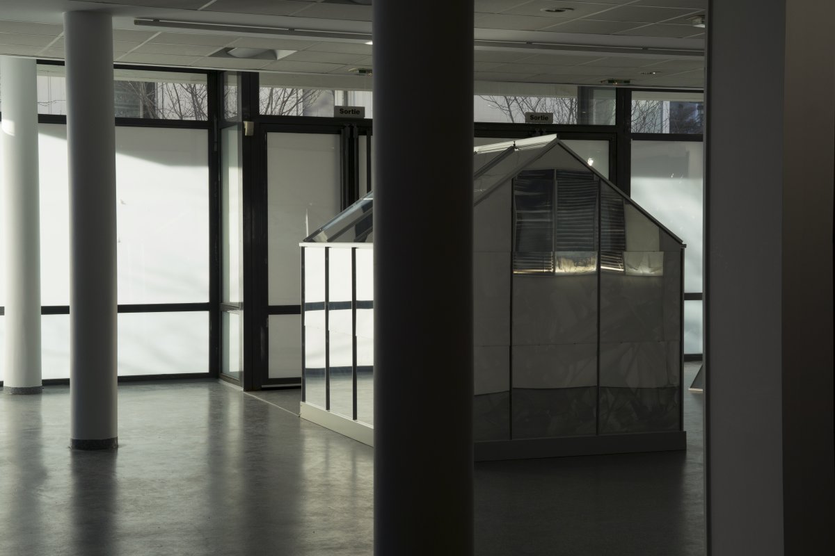 Ad retro, c’est le côté caché de la peinture, la face opposée. À la manière des peintres en bâtiment Justin Weiler a recouvert les vitres d’une serre de jardinage avec du blanc de Meudon. C’est dans une gestuelle frénétique et avec exaltation qu’il utilise ce médium, celui-ci vient se fixer et s’accrocher sur la vitre, alors support, pour la rendre opaque. Chaque couche vient effacer la précédente et ne laisse que quelques traces pourtant visibles puisque nous sommes de l’autre côté. Justin Weiler nous donne à voir ce qui est d’habitude dissimulé par les différentes strates. Bien qu’opaque, la surface ne s’oppose pas au passage de la lumière et des néons viennent révéler les différents niveaux de blanc.