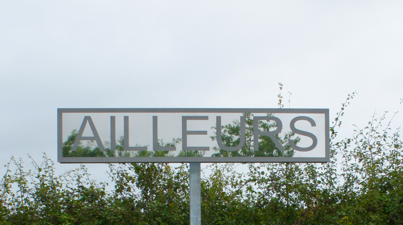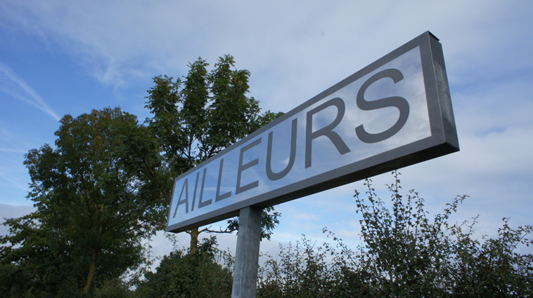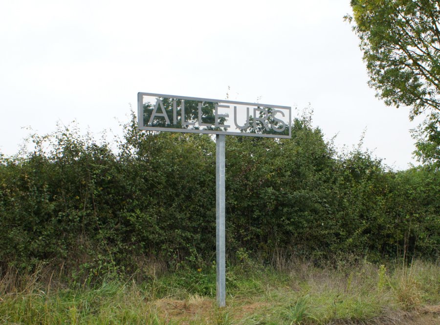 Bernard Calet, «Ailleurs», 2011, Acier poli miroir et dépoli à l’endroit des lettres, ancienne ligne de chemin de fer, Neuil-les-Aubiers, photographie : ©Bernard Calet