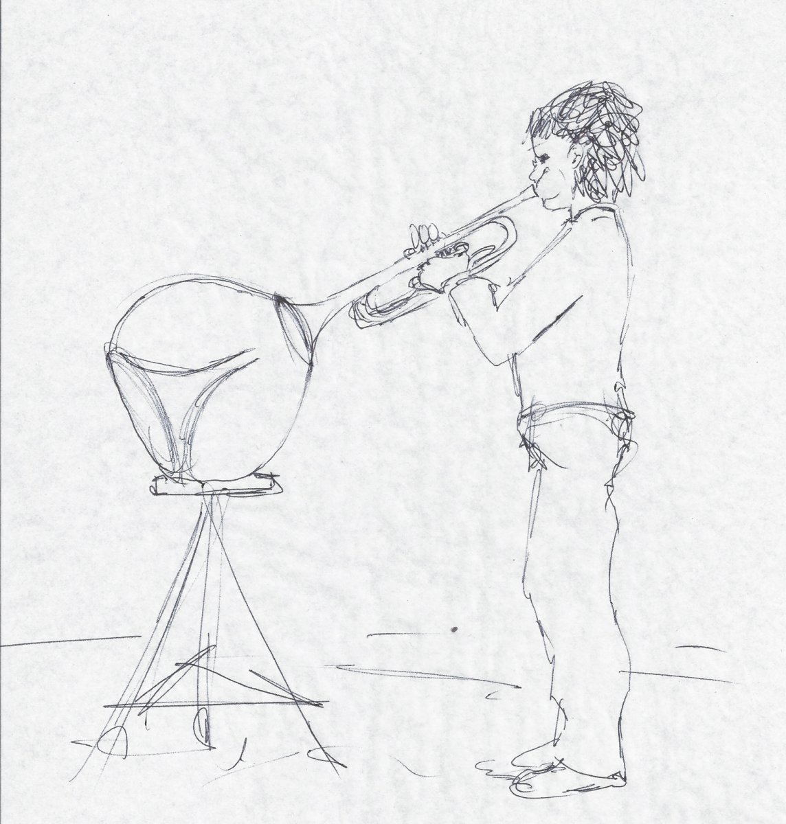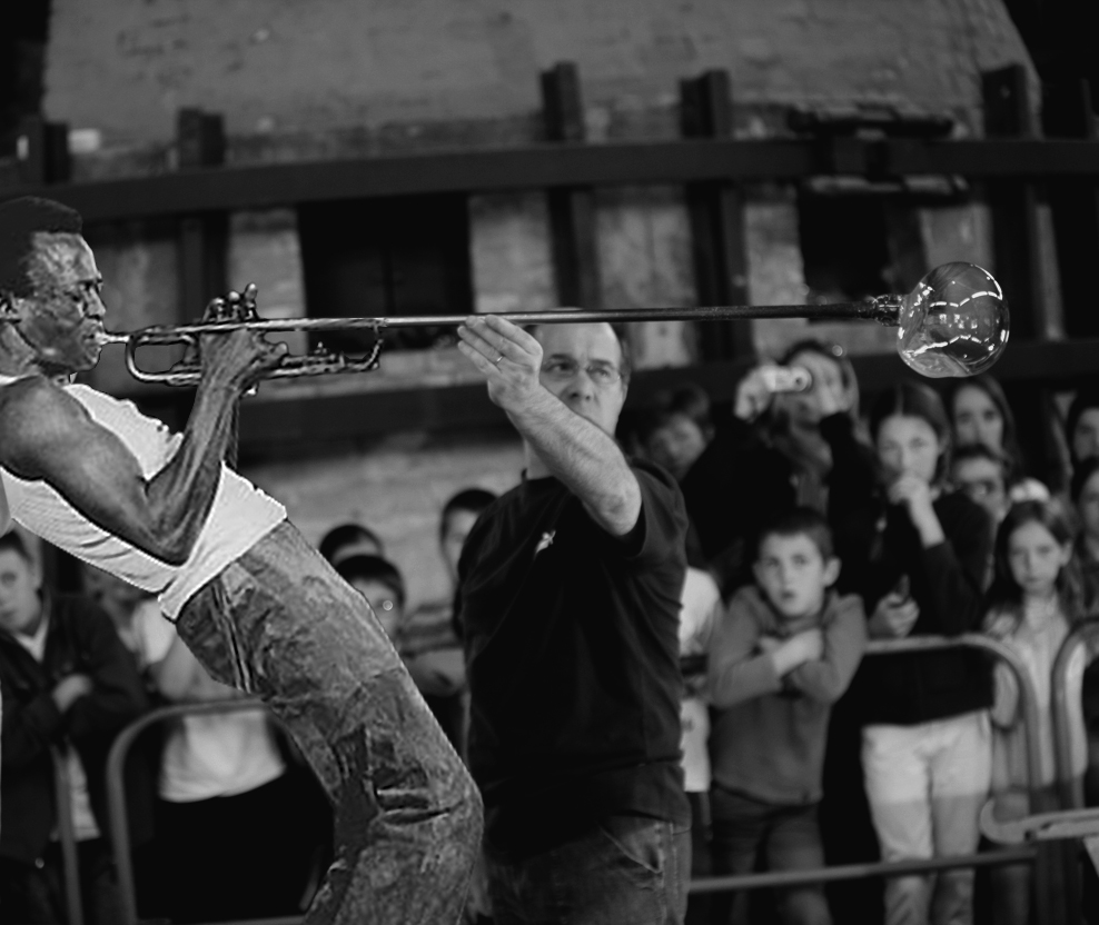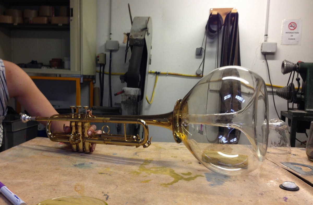 L’ objectif est de réunir ces deux pratiques au sein de l’atelier, avec pour idée de créer des sculptures de verre soufflé, produites à l’aide d’un instrument à vent, plus précisément d’une trompette « modifiée » au sein d’un atelier de lutherie **.