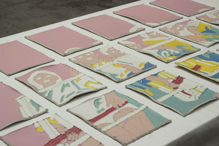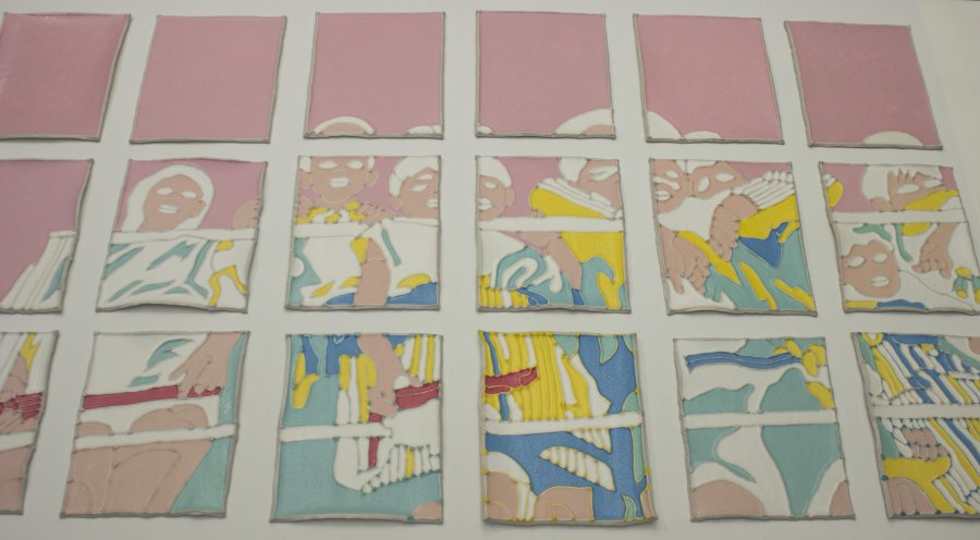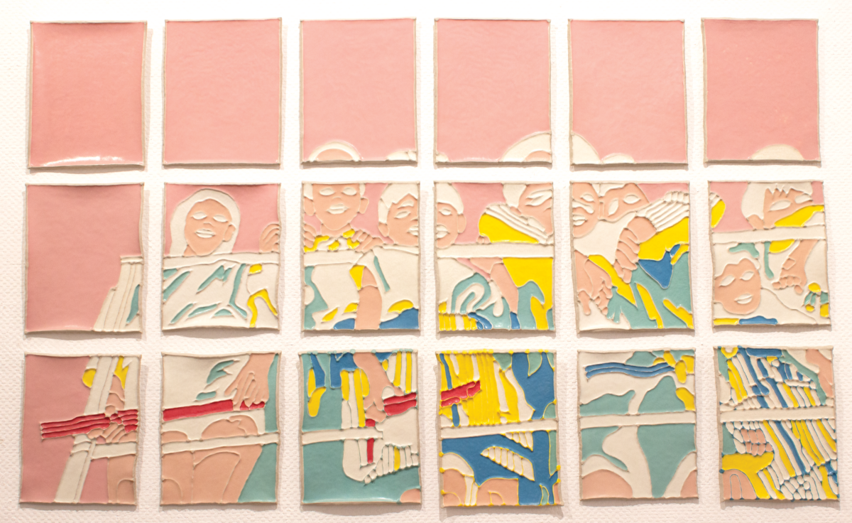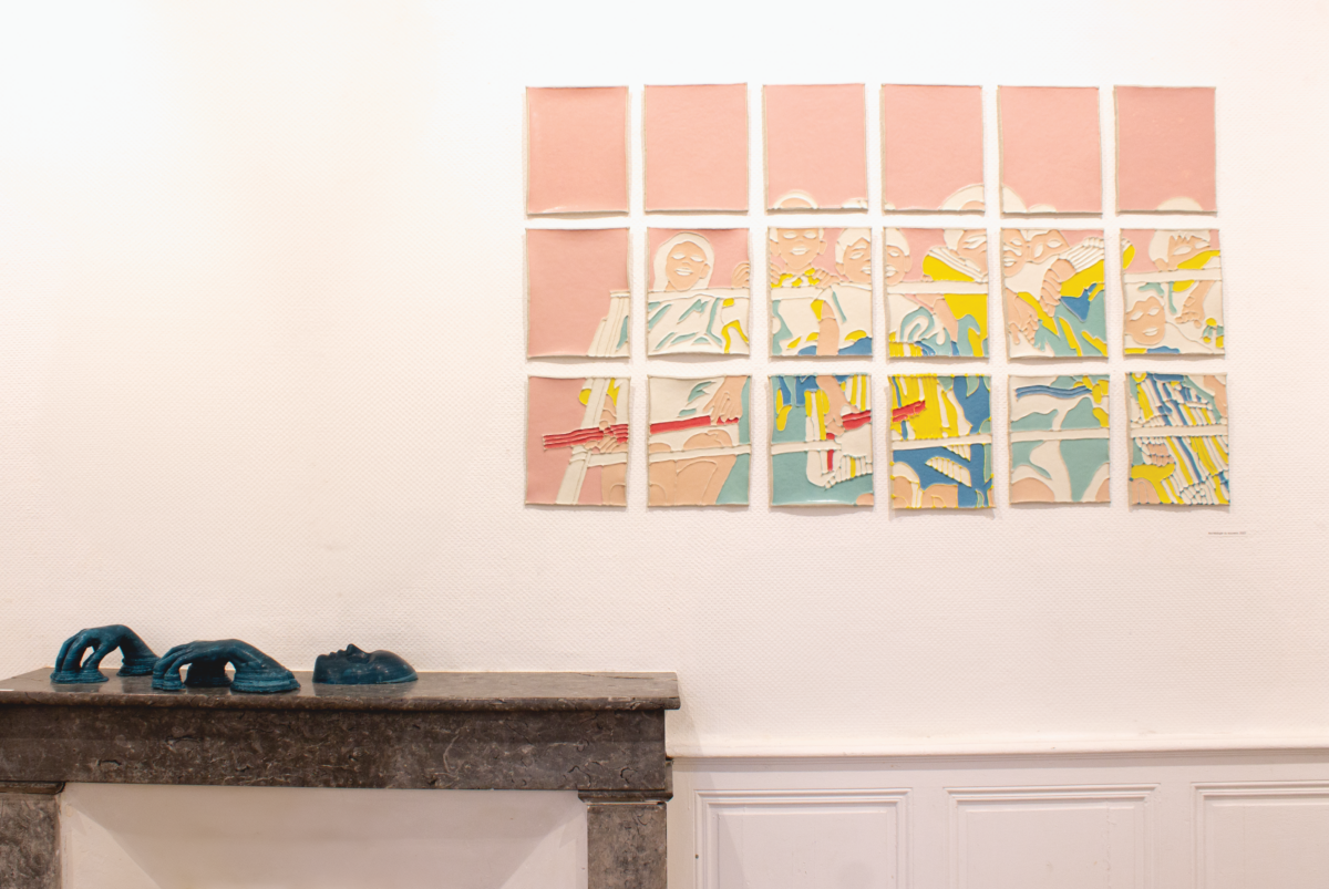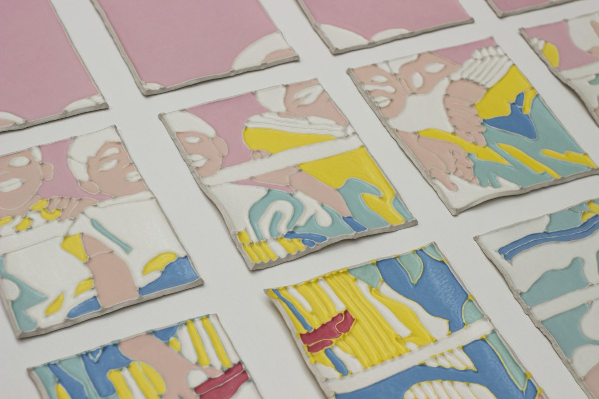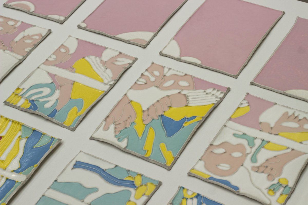 L’installation en céramique, réalisée à partir d’une photographie d’enfance de l’artiste, se présente comme l’empreinte archéologique d’un souvenir enfoui qui ressurgit. A travers la mémoire tactile et intime, elle convoque des sensations ambivalentes liées à l’enfance et à ses représentations. Les couleurs douces renvoient à l’insouciance de l’enfance.