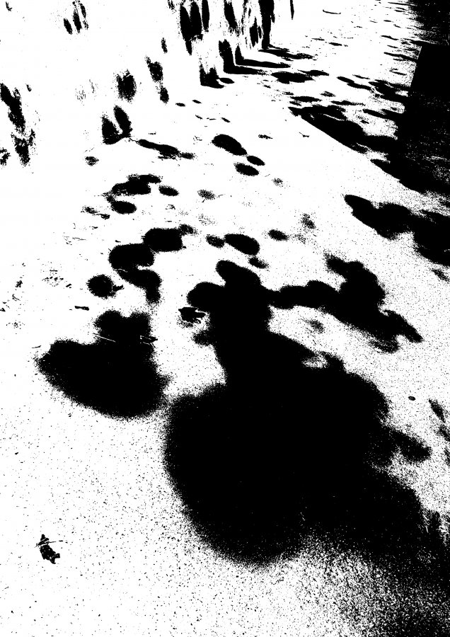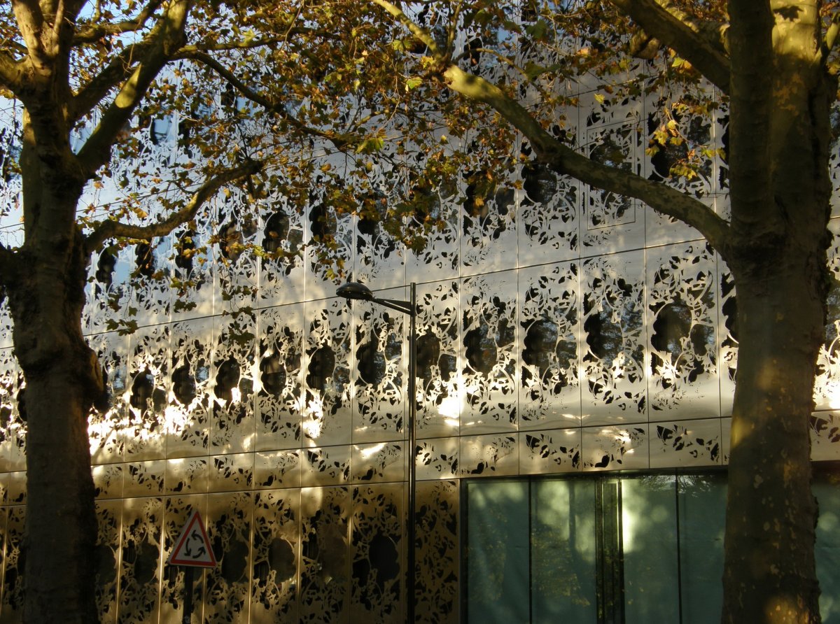 Le motif réuni 3 éléments du paysage environnant : le feuillage des platanes , leurs ombres projetés, la porte forgée de la maison adjacente de ces futurs bureaux.
