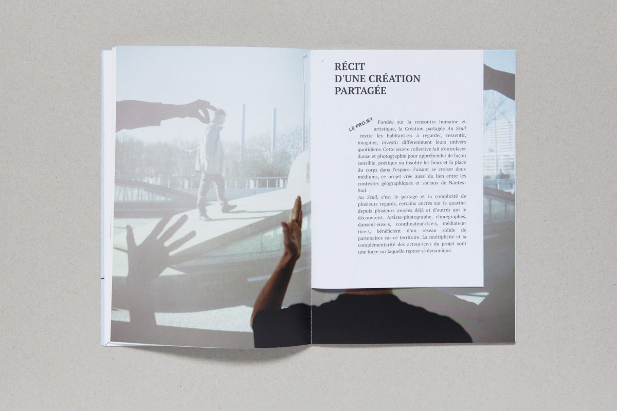 Fondée sur la rencontre humaine et artistique, la Création partagée Au Seuil a invité les habitant.e.s à regarder, ressentir, imaginer, investir différemment leurs univers quotidiens. Cette œuvre collective entrelace danse et photographie pour appréhender de façon sensible, poétique ou insolite les lieux et la place du corps dans l’espace. Faisant se croiser deux médiums, ce projet a crée aussi du lien entre les contextes géographiques et sociaux de Nantes-Sud. Au seuil a pris la forme d’une exposition dans les vitrines du quartier et d’une édition construite avec la graphiste Emmy Marchesse.