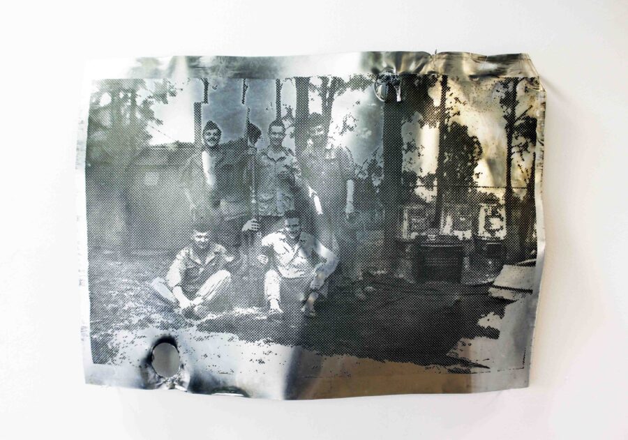 Déconcertée par l’apparente légèreté de son récit, correspondant aux sourires affichés sur les photos, j’ai travaillé cette série d’images en gravure : mordues à l’acide, les plaques deviennent un support de mémoire.