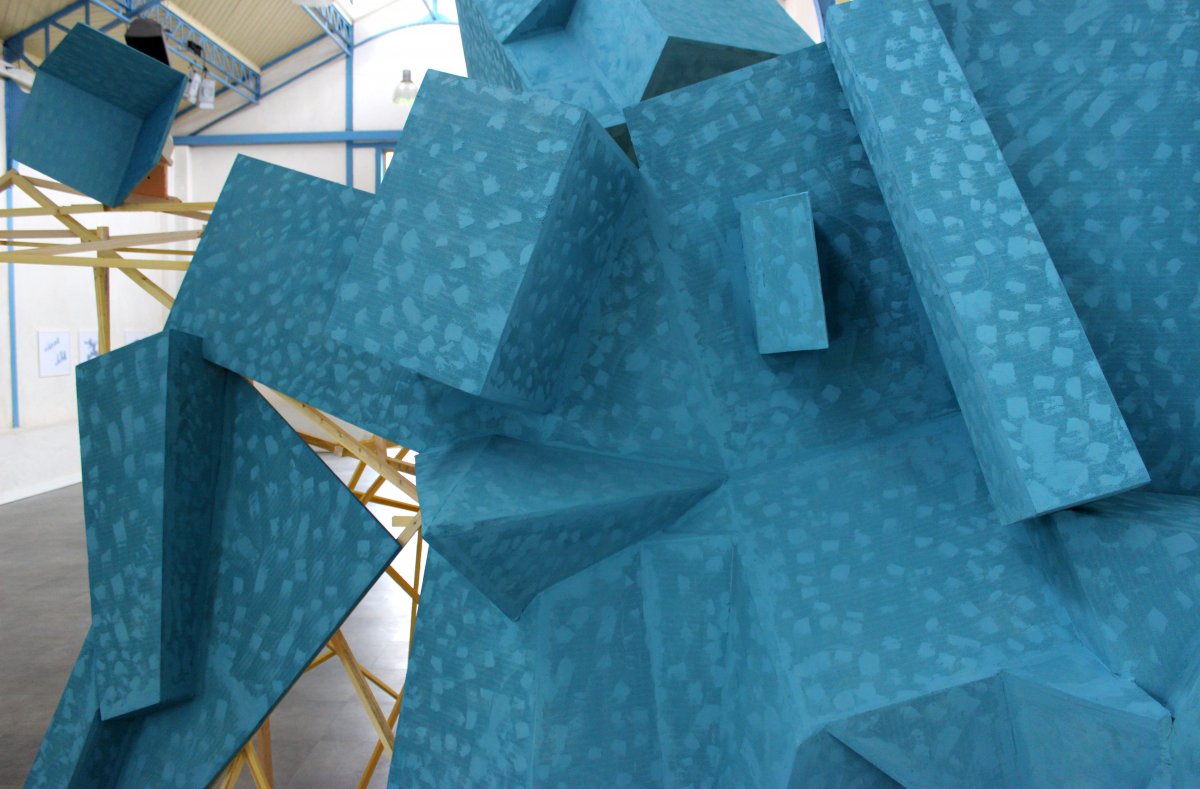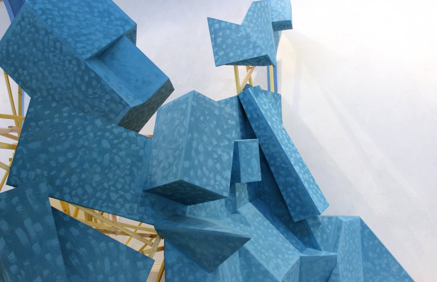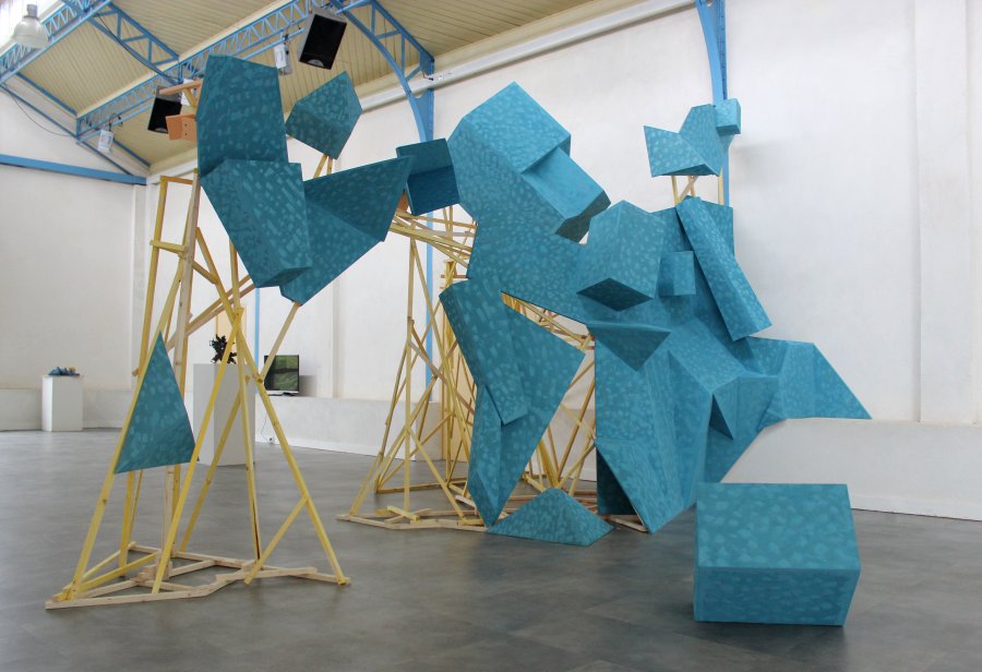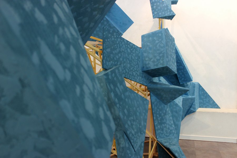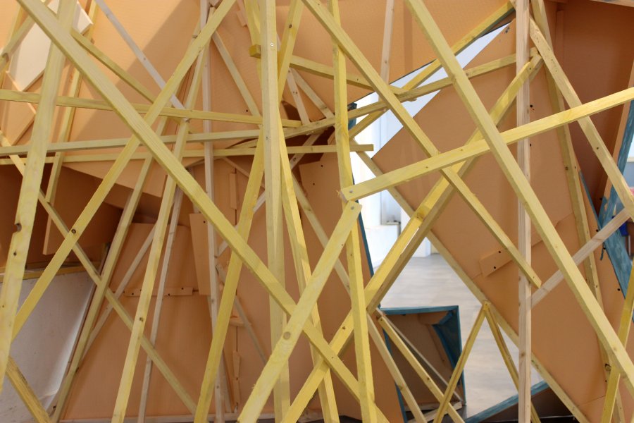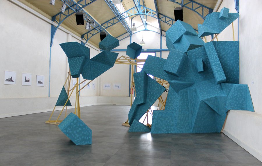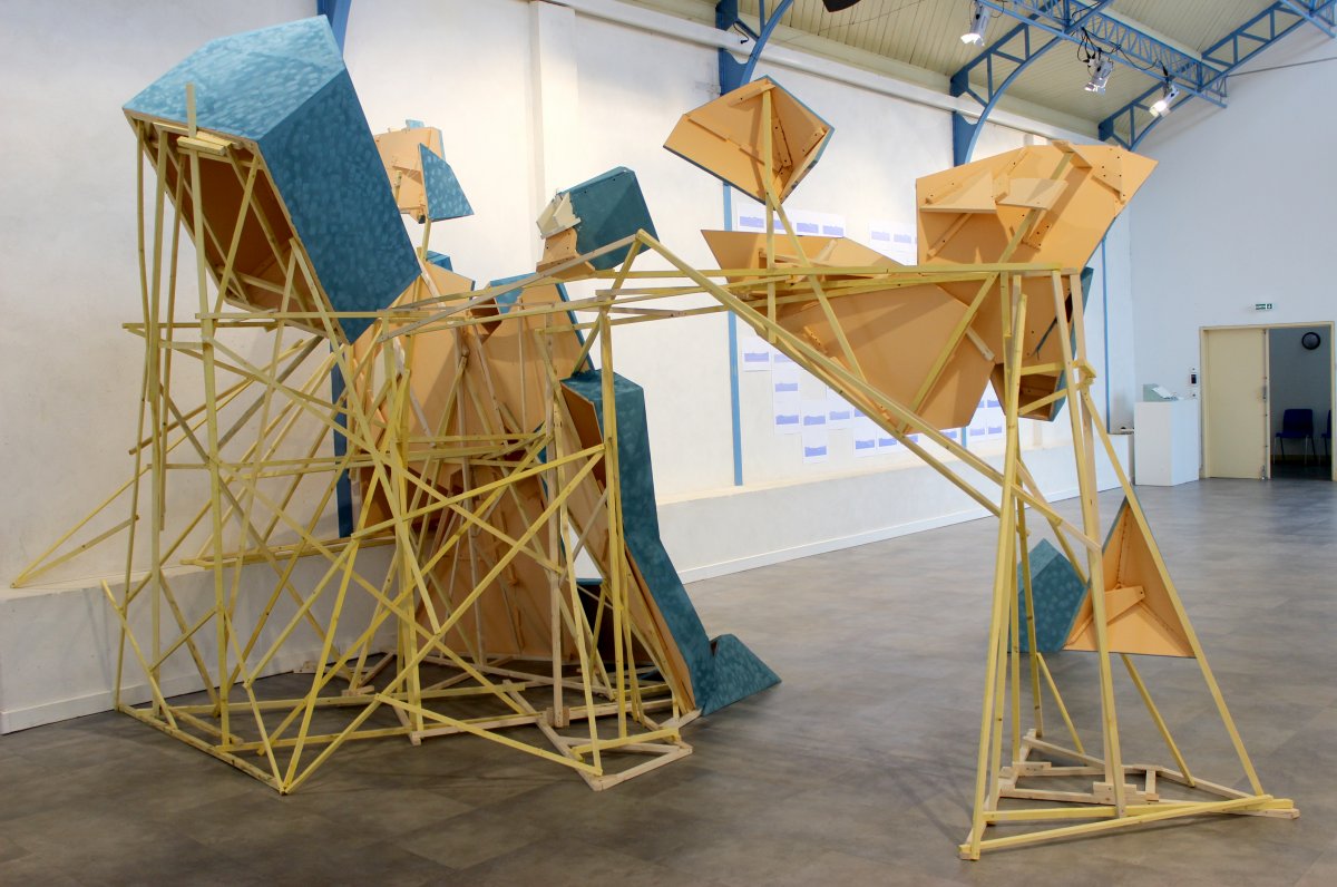 BanRurbanisme, est une installation éphémère réalisée dans le cadre d’un résidence en Anjou Bleu à Pouancé. C’est une évocation des mines d’ardoise, mais également de vus aérienne du paysage avec du bâti. C’est un travail sur le faut semblant et le décor. Polystyrène extrudé, bois, vis, colle chaude, peinture acrylique, enduit. 4m de haut