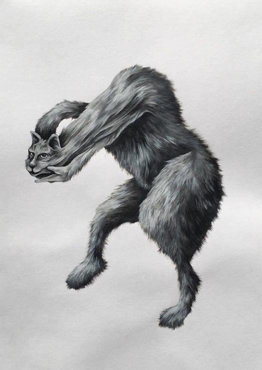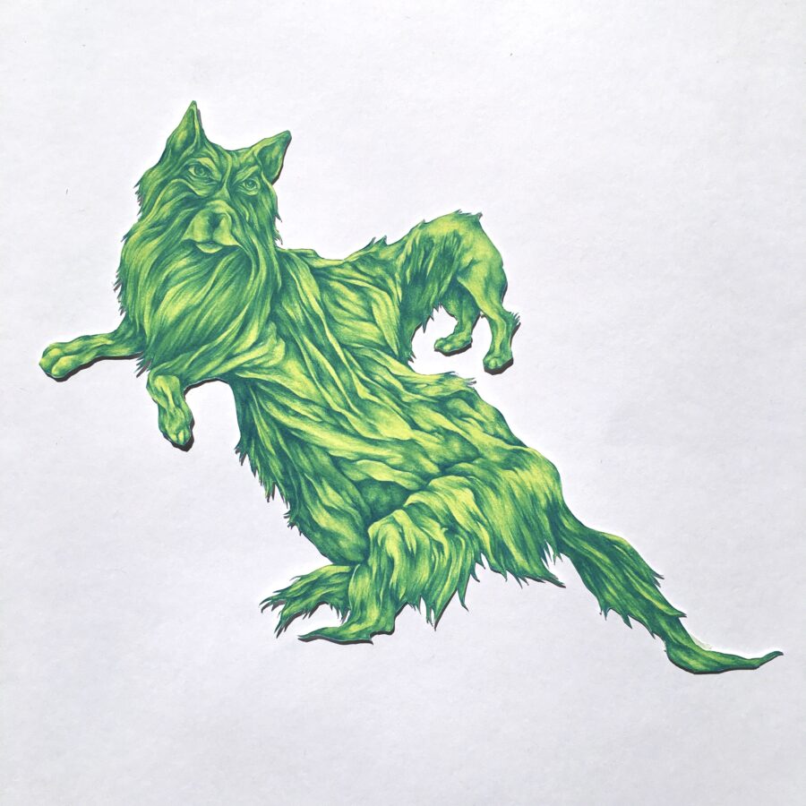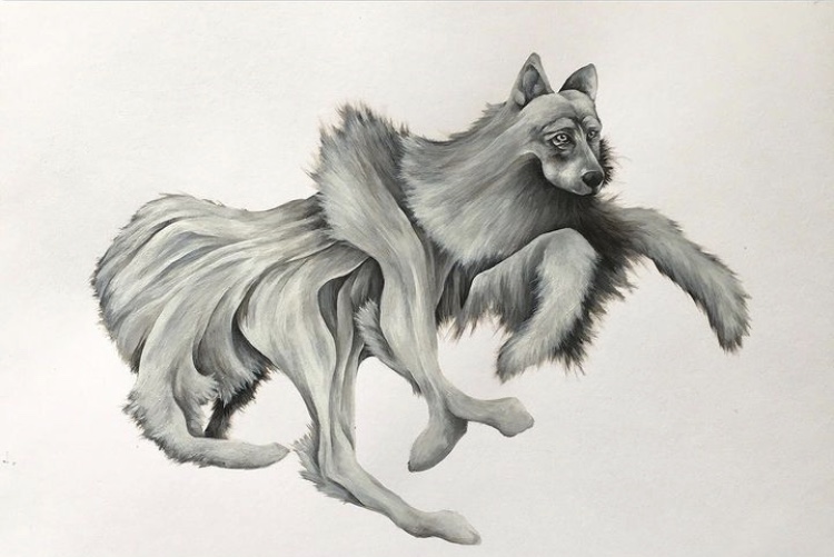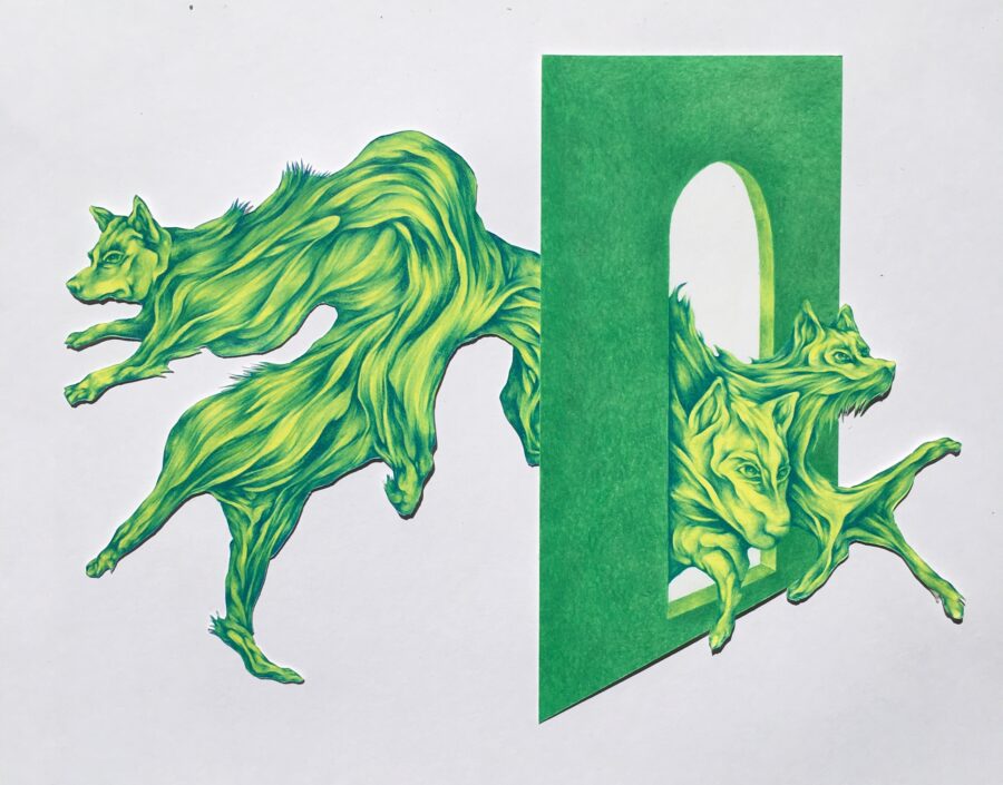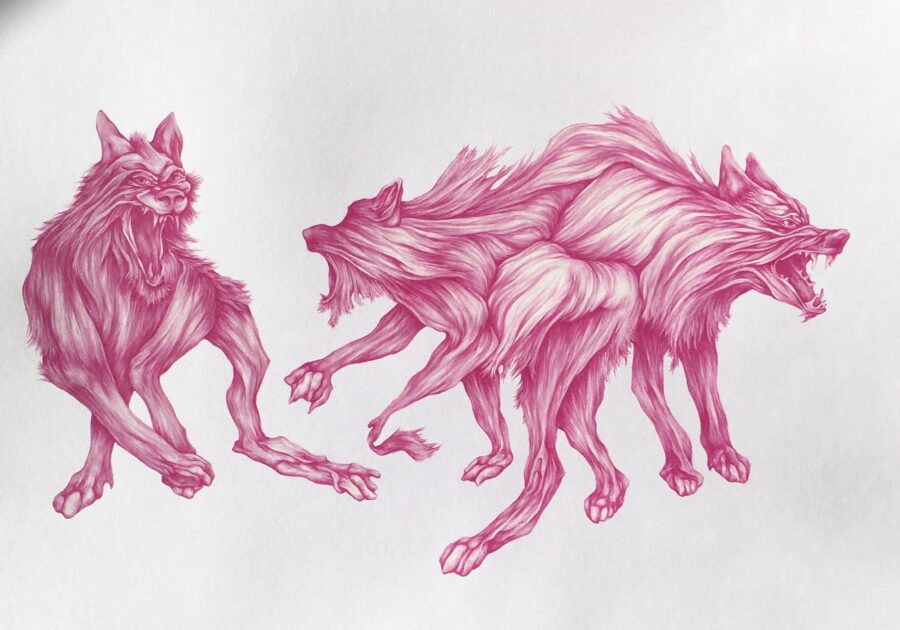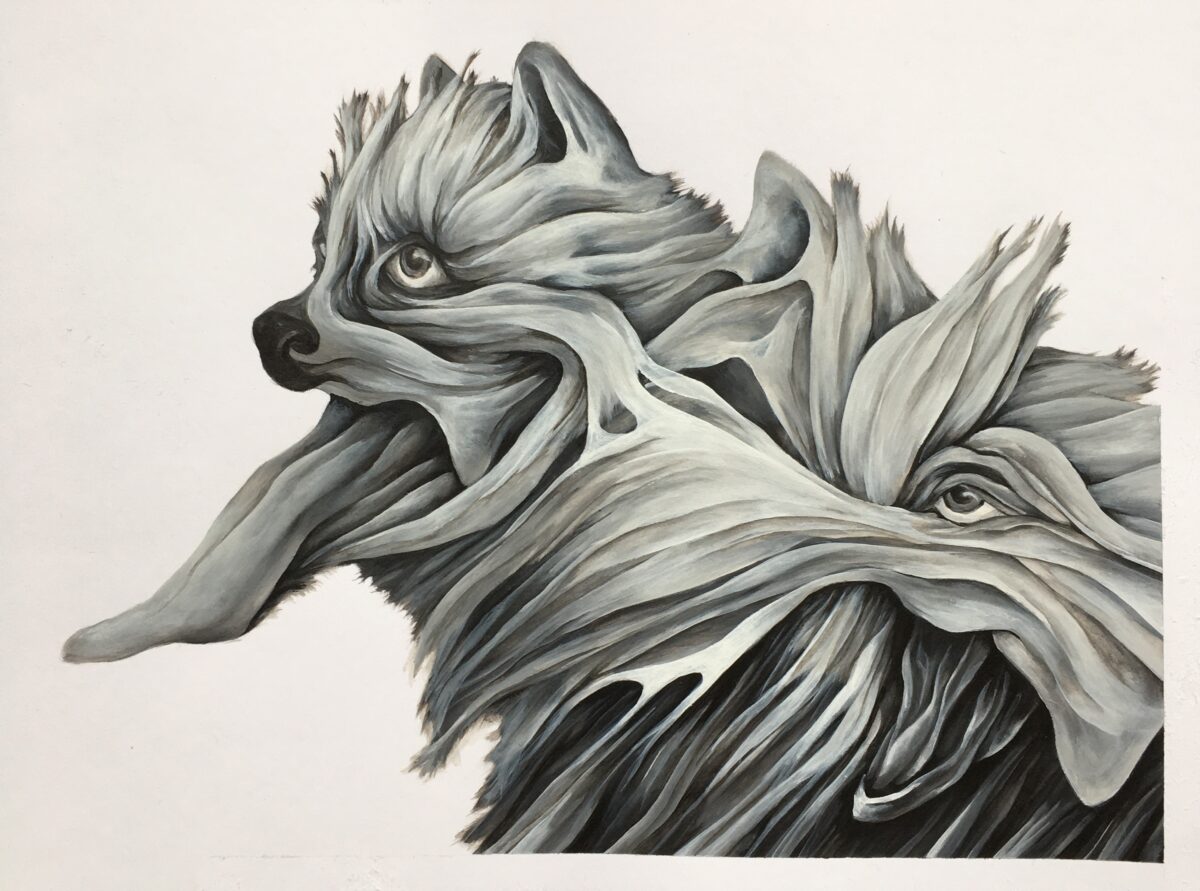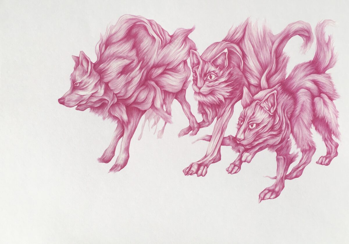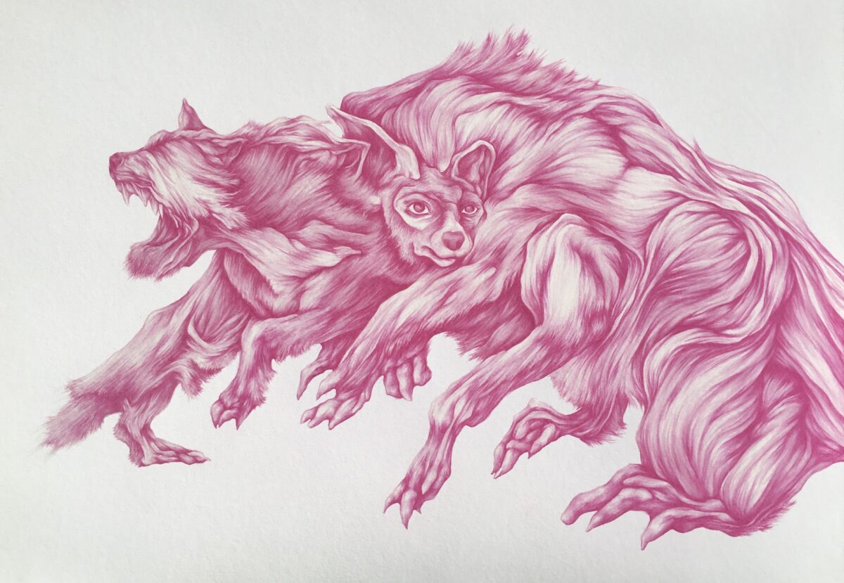 Inspirées des bestiaires réalisés d’après des récits de voyage, les formes naissent d’une première commande à un logiciel en ligne générateur d’image à partir d’une phrase associant « chien », « chat » et « loup » à des émotions et situations humaines. Comptant parmi les plus archaïques disponibles gratuitement, l’IA convoquée produit ensuite des images toujours uniques mais de qualité discutable. Des éléments sélectionnés au sein de ces productions virtuelles s’articulent par le dessin au crayon. De ces images inégales réalisées par la machine, une nouvelle est créée en s’appliquant à adoucir et harmoniser les incohérences. Dans un registre SF, ce travail s’amuse à envisager l’IA comme un oracle, une entité atemporelle communiquant tant bien que mal les mutations des espèces dans une époque future peut-être sans technologie numérique et sans humain. Le dessin est l’interprétation de ses visions.