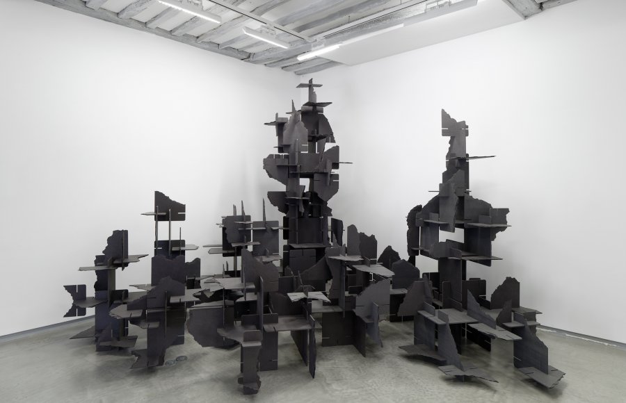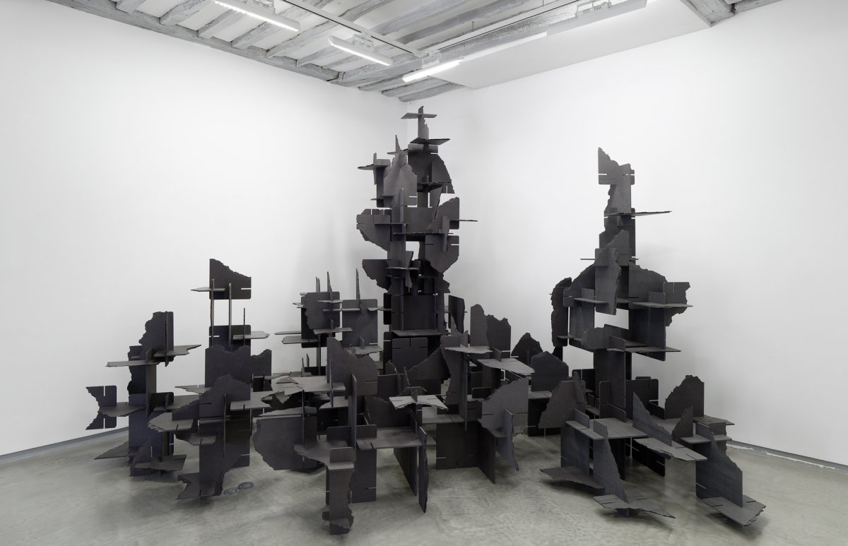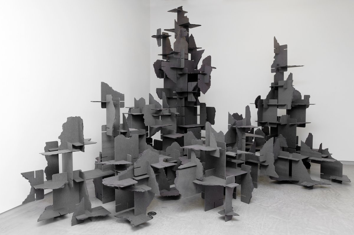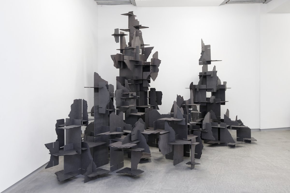 Dans le cas de cette sculpture, contrairement au jeu d’origine, les cartes sont d’une couleur identique, un gris anthracite uniforme. Grâce à cela, un jeu d’ombre très riche se crée grâce aux multiples orientations des plaques et à leurs superpositions. L’aspect architectural et graphique de la construction est renforcé par l’unité colorée de l’ensemble contrastant radicalement avec les visuels, les «good stuff», qui ornaient le jeu d’origine. La forme devient une abstraction et revendique pleinement sa nature d’assemblage proliférant.