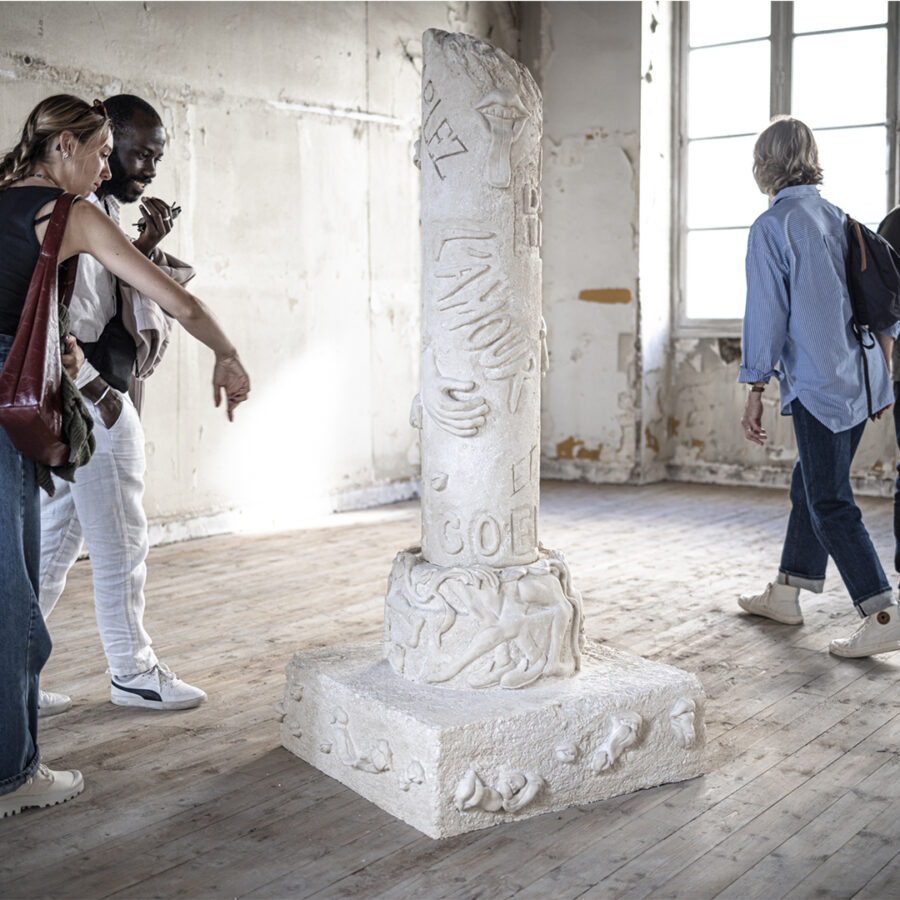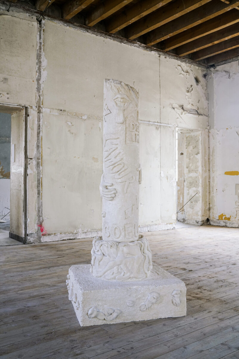 Tirer la langue a beau être innocent, ce geste pourrait appeler à l’insurrection. Le titre de la colonne et l’inscription « parlez mes douces images, portez l’amour et la tendresse du cœur » évoquent le Chapiteau des baisers de 1898 d’Émile Derré, sculpteur sympathisant anarchiste. À l’époque d’une statuomanie dix-neuvièmiste qui veut à chaque notable son monument, cette sculpture fait figure d’exception par sa dédicace à la Commune de Paris. Pendant plus de dix ans, elle sera d’ailleurs momentanément déboulonnée, en proie à la dégradation. Des Communards, têtes de proue du mouvement, s’y embrassent loin de toute brutalité, célébrant l’amour et les grands idéaux survivant à la mort. Notre œuvre emprunte à ce romantisme universaliste par le style de la colonne brisée qui, traditionnellement, se dresse au-dessus des tombeaux pour symboliser une vie éteinte précocement.
