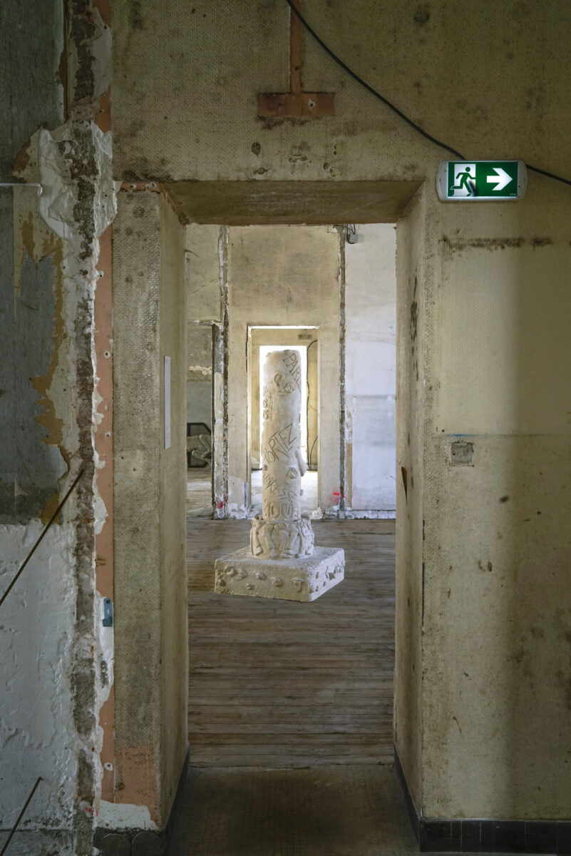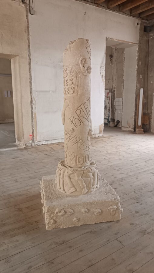 Avec malice, la colonne indocile tire la langue à ses geôliers : des bas-reliefs de chiens maquillés aux couleurs des murs du palais défraîchi qu’est l’Hôtel de Craon. Le décor bourgeois devient camouflage tactique. Au repos comme sur leurs gardes, ces chiens sont des Leurres. Les grilles de métal qui les accompagnent protègent autant qu’elles enferment : les serrures sont-elles ouvertes ou fermées ? Les chiens sont-ils dehors ou dedans ? Hagards, ces rôdeurs ramènent à l’histoire ancienne du lieu qui, après avoir été le refuge d’un cercle d’esthètes amoureux des arts, devient commissariat. Aussi, la graphie de l’inscription sur le fût reprend celle des graffitis des cellules aujourd’hui closes. Elle s’inspire également de ceux sur les murs de la Tour de la Lanterne. Autrefois prison de La Rochelle, elle a en effet détenu de nombreux Communards comme Louise Michel avant leur déportation en Kanaky.
