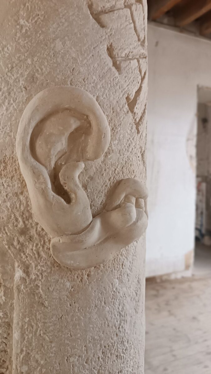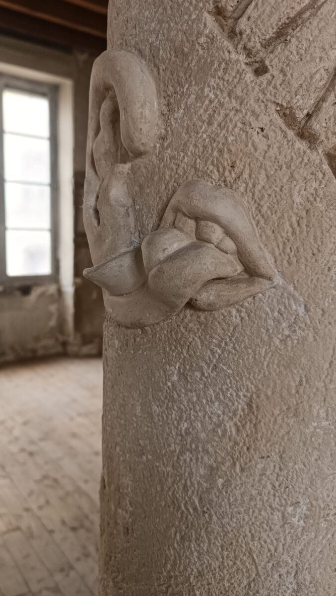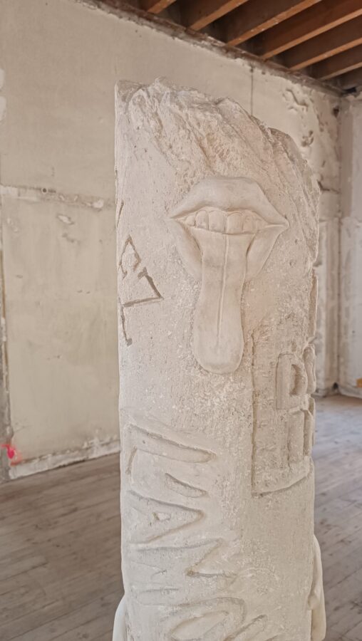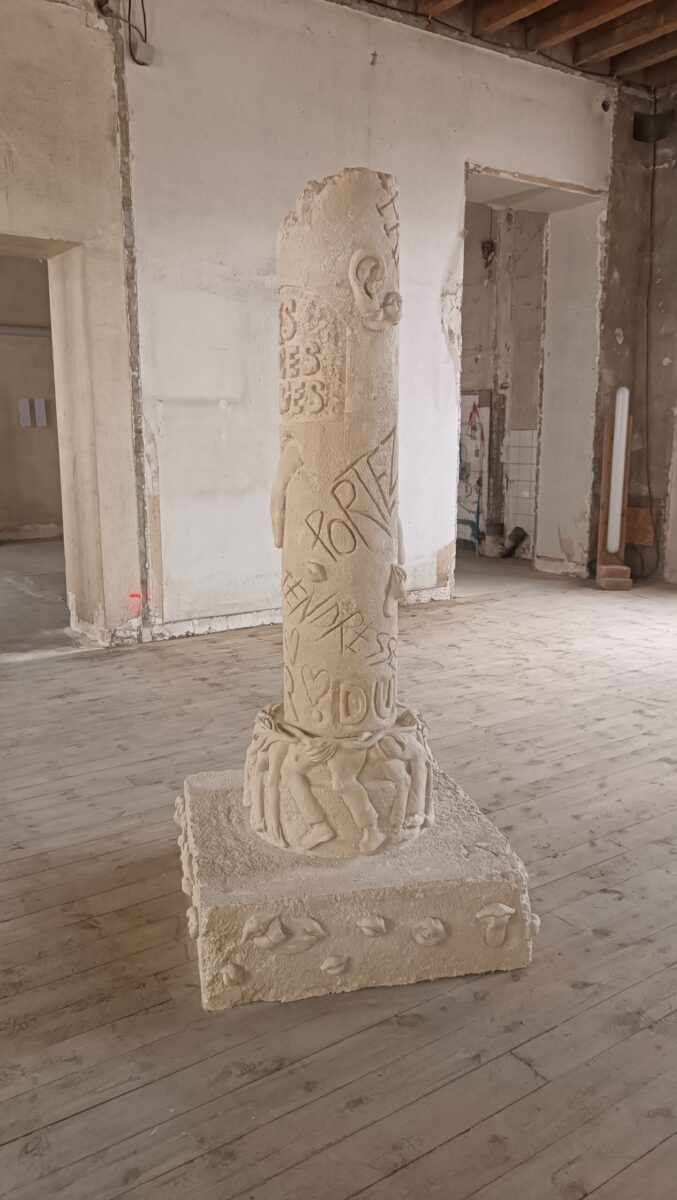 Nous dévoilons aujourd’hui ensemble le monument Brisée et baisers qui trône au milieu de la pièce qui l’a vue naître. Cette colonne, dite tronquée ou brisée, s’anime par ses bouches, ses bras avec lesquels elle s’étreint elle-même. Grotesque et aguicheuse. De nombreuses paires de jambes prises dans une ronde enfiévrée, loin de la déséquilibrer, la soutiennent et l’ancrent dans une vrille à en faire tourner la tête.