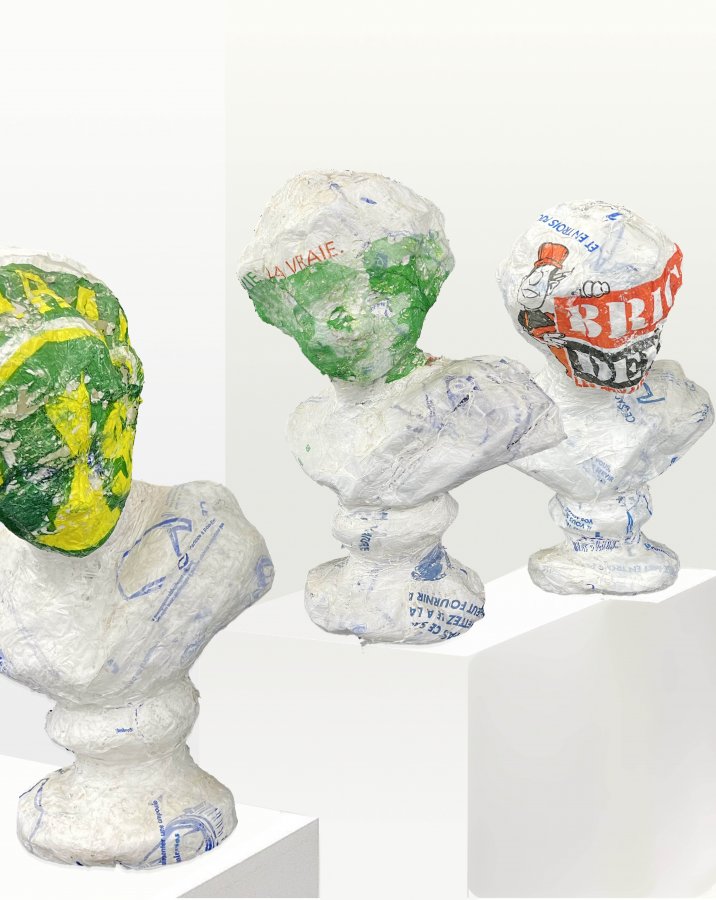 ← Jean-François Courtilat 1/2 COURTILAT, «Bustes thermoformés avec des sacs plastiques», 2021, PLASTIQUES Courtilat, «Bustes en sac plastiques», 2021, Buste en plâtre Thermoformés avec des sacs plastiques Bustes sacs plastiques