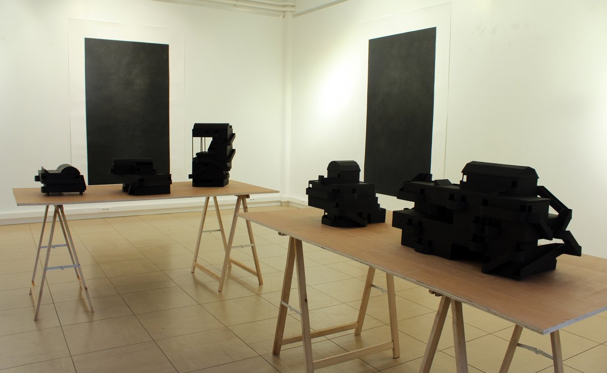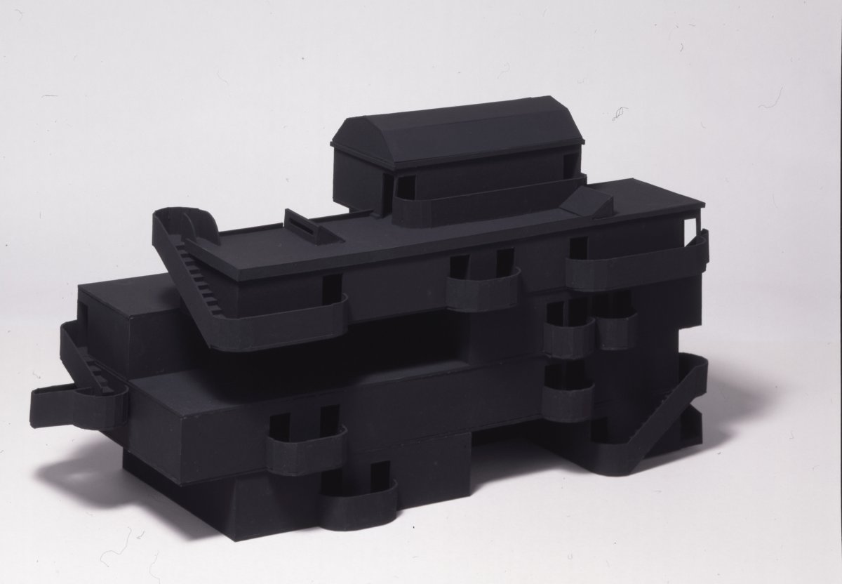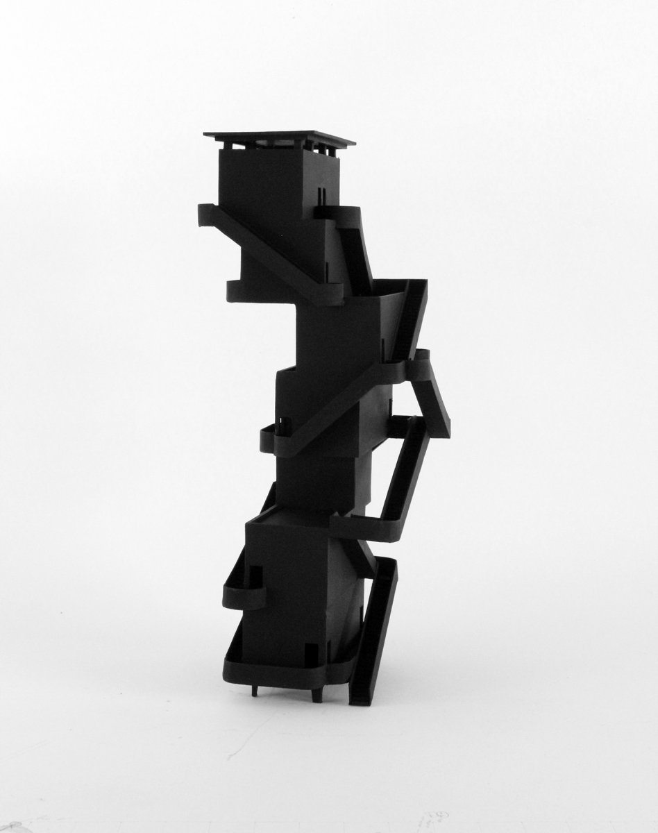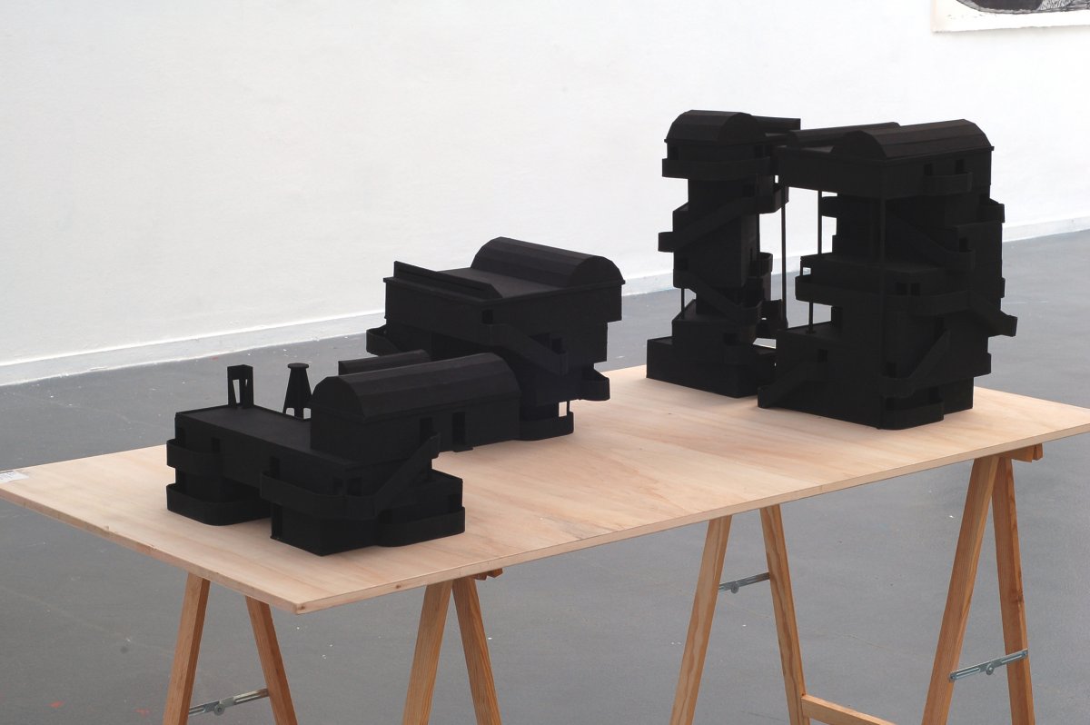 Ensuite, un ensemble de volumes architecturaux peints en noir. Ceux-ci correspondraient à des titres de Diderot traduits en braille puis mis en volume. Les doubles carrés du braille deviennent doubles cubes, les points deviennent portes, le parcours passages et escaliers. Le noir viendrait casser ou contredire le volume, en fausserlaperception. L’échelle serait celle de la main. Parcours de la main dans l’espace selon un texte.