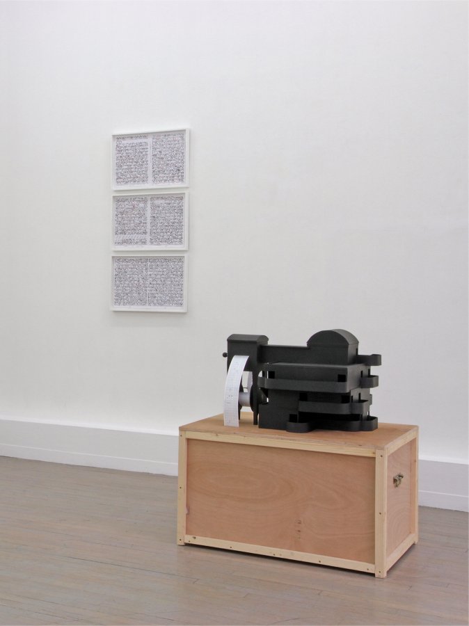 La première opération consisterait à rendre illisible le texte en le traduisant en braille. Un braille inopérant, plat, au feutre, illisible aussi bien par ceux les aveugles que par ceux qui voient. Grossir les points jusqu’à leur jonction, jusqu’aux dimensions de la pulpe du doigt ; ce qui serait montré serait moins l’écriture elle-même que le parcours tactile qu’effectuerait un aveugle en lisant le texte. Parcours d’un doigt sur une feuille selon un texte.