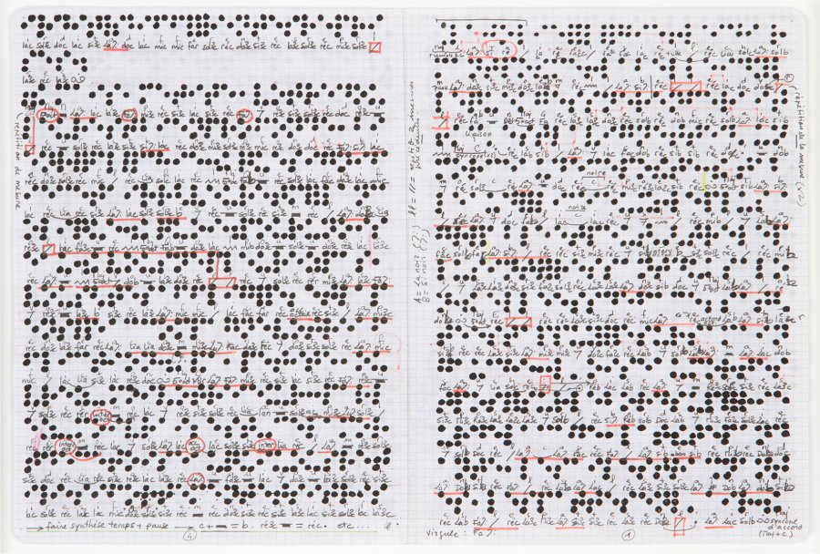 Enfin, la transposition musicale dutexte de départ. Par le système d’équivalence existant entre braille alphabétique et braille musical, chaque lettre, chaqueponstuation serait convertie en note ou signe musical. Jouée sur GarageBand, la musique serait ensuite gravée sur CD.