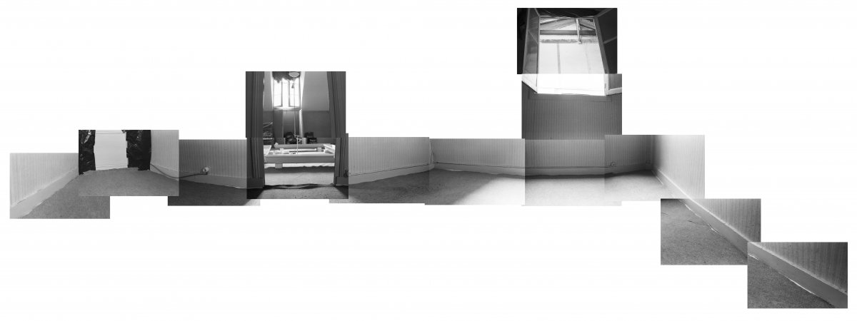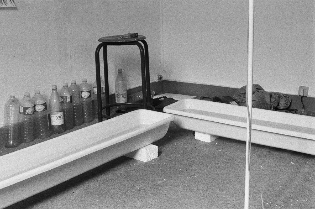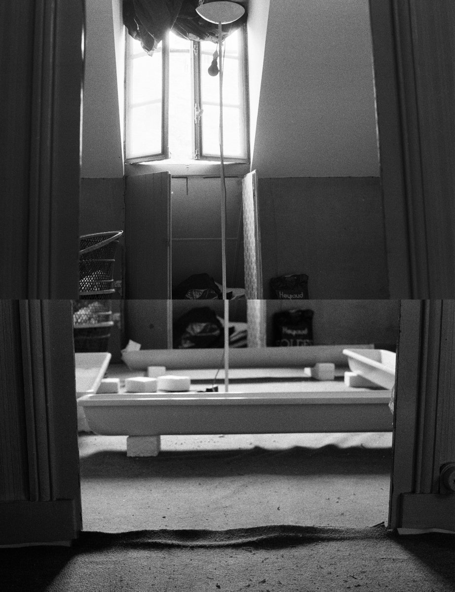 « Tout mon appartement a d’abord été transformé en labo photo : les ouvertures ont été occultées et de la lumière rouge inactinique a été installée. J’ai ensuite enlevé la moquette de la chambre pour mettre sur toute la surface du sol du papier photo, la partie photosensible tournée vers le plafond. Après cette opération j’ai remis la moquette à sa place et j’ai exposé le papier à la lumière en ouvrant les fenêtres pendant environ une heure. »