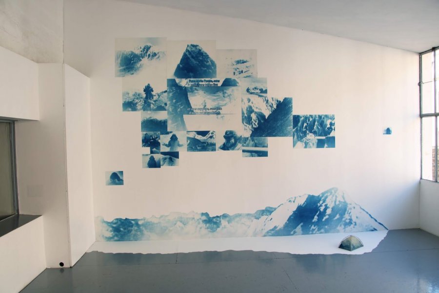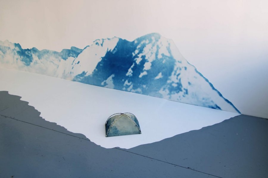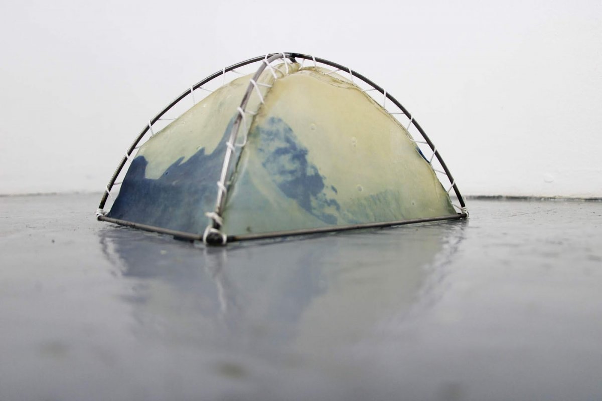 Camp de base est une série de prototype d’habitats mobiles. Accrochées aux parois de l’espace d’exposition, telles des trophées. Des maquettes en deux parties, l’ossature en acier et son envelope en gélatine, sont comme prêtes à être assemblées par le visiteur.