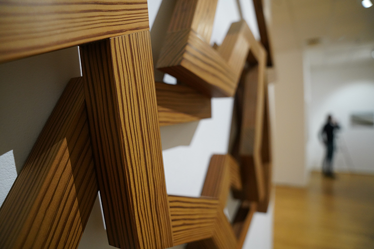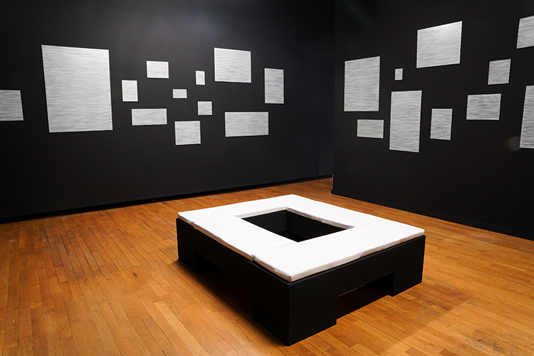 Au coeur de la démarche d’Olivier Petiteau, l’économie de son propre travail se frotte à la mise en regard de l’économie industrielle, de l’ère machinique et productive. L’artiste réexamine depuis le paradigme capitaliste un rapport de force entre énergie et dépense. Dans ses lignes, ses formes élémentaires, tension du tracé et sphère de l’intention alternent avec le pur équilibre d’un régime qui pourrait paraître mécanique. Olivier Petiteau crée un jeu sur la coexistence d’éléments opposés, de réalités inconciliables, comme le contraste maximum du blanc et noir, associé à des surfaces bétonnées ou marquetées. Il représente le monde à coup de placoplâtre, de bois, d’acier, de béton. Avec lui, les informations quantifiées prennent une dimension sensible et poétique. L’artisanat et l’industriel se superposent et poussent les limites du signe à l’essentiel dans un processus d’interprétation subjective de l’univoque. L’information, une fois évidée, reprend ses droits sensibles, jusqu’à cette oeuvre où l’artiste fait saillir une mâchoire bovine d’un ensemble de hachures noires et blanches: superposition de possibles imaginaires, le trophée animal se mue en un nouveau fétiche industriel («Sans titre à la mâchoire» 2018).
