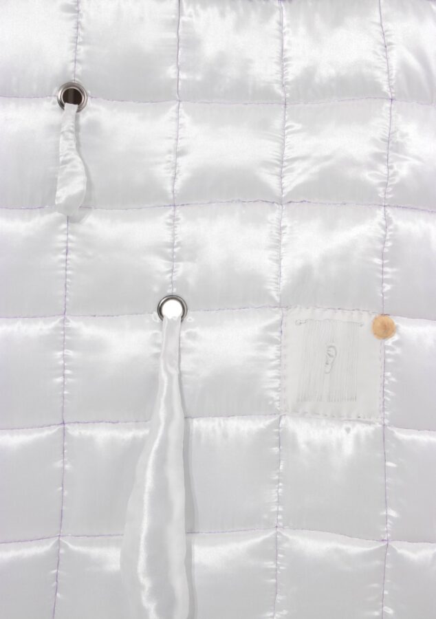 satin, ouatine, soie, perles, chaines, oeillets, latex, acier, dessin sur satin et sur soie, enceinte, 3 parties de 250×150 cm