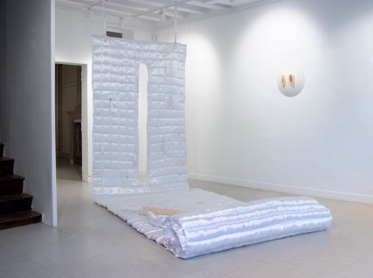 satin, ouatine, soie, perles, chaines, oeillets, latex, acier, dessin sur satin et sur soie, enceinte, 3 parties de 250×150 cm