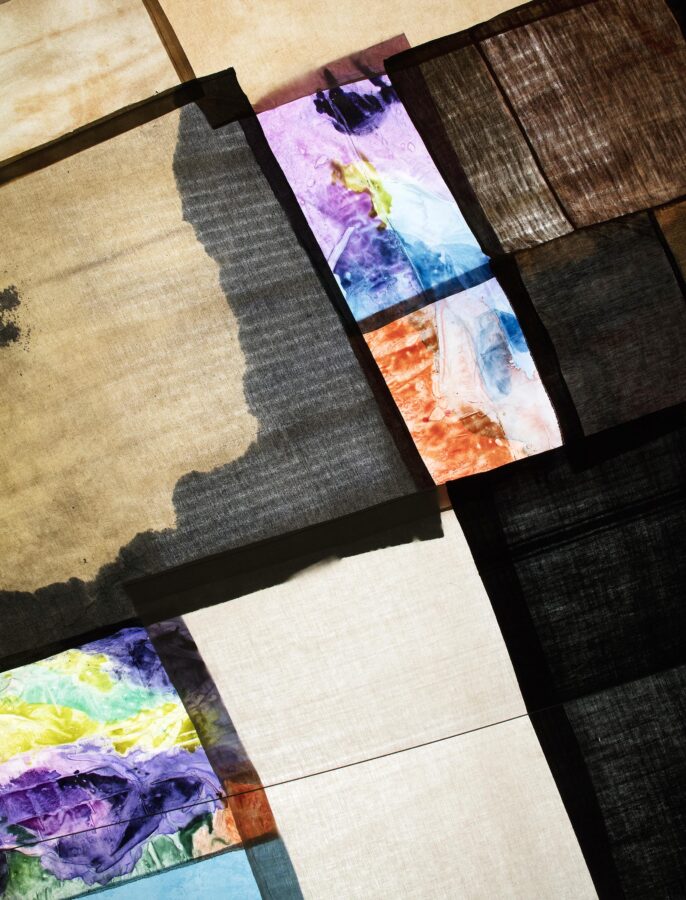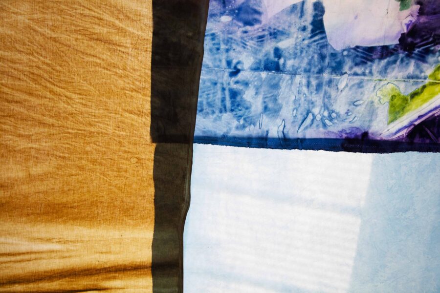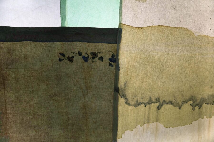 « C’est dans l’idée de paysage, et ses reconfigurations au prisme de l’art textile, que la pratique de Claire Amiot trouve l’un de ses fondements. Les œuvres qu’elle conçoit ont trait aux états émotionnels dérivés du contact avec la nature ; l’évocation du grandiose y côtoie celle de l’infime, le détail précaire – empreintes et tâches, pigments et résidus – y atteste la solidité de l’émotion et s’offre comme clef de voûte d’un rapport sensible au monde. La matière du paysage, l’action de la marée ou de la rosée, les couleurs extraites des végétaux, sont mis à contribution comme autant d’ingrédients picturaux, – la substance même de l’œuvre en est extraite. À l’issue de ce processus, largement modelé par un hasard que l’artiste favorise afin d’y mieux reconnaître la nécessité de son propre geste créatif, l’œuvre-paysage, déployée dans l’espace et arpentée par le spectateur, se substitue à la réalité initialement entrevue, au paysage premier d’où a surgi l’émotion. Elle en conserve néanmoins l’empreinte, à la manière d’un palimpseste, ou plutôt d’un tataki zomé, technique japonaise d’impression végétale avec laquelle s’est familiarisée Claire Amiot.