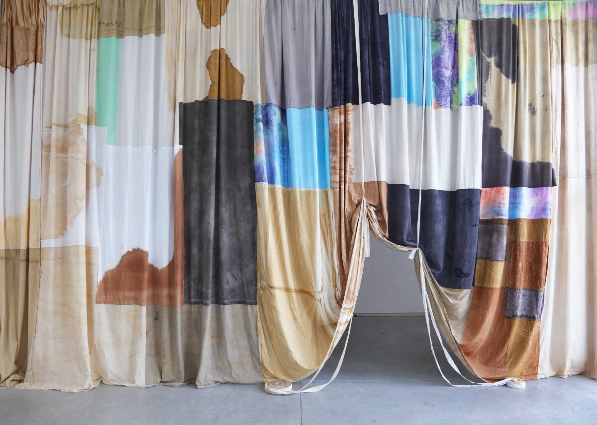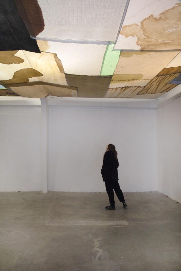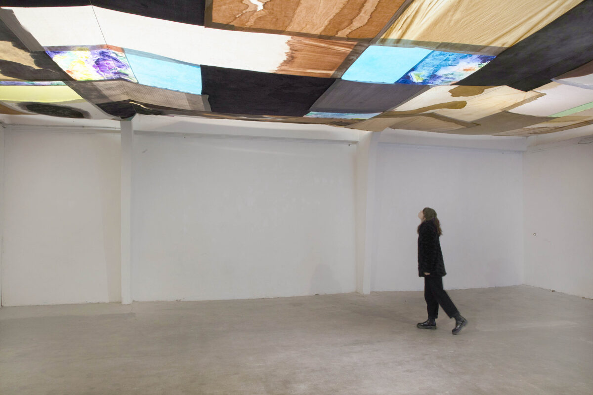Catabase (la descente aux enfers dans le mythe grec, à la fois épreuve d’initiation et acte de transgression) met en jeu cette même logique du paysage, dont elle renouvelle parallèlement les codes. Car ici tout se joue en hauteur, comme pour mieux indiquer à ceux qui s’avancent dans l’espace d’exposition que la descente a déjà eu lieu, que c’est depuis les régions infernales qu’ils envisagent le point de départ de leur voyage, et l’éventualité d’un retour. La question se pose alors de savoir où est l’œuvre : s’agit-il du ciel fluide tendu en travers de la pièce, et qui voit se juxtaposer teintures végétales et pigments synthétiques, ou bien faut-il la trouver dans l’en-deçà vide où se dépose la lumière venue du monde extérieur, dans le foyer souterrain où convergent ses rayons ? Cette tension constitutive se reflète dans le choix des matériaux et les techniques employées, dessinant une esthétique hybride, où l’artifice voisine avec le naturel, la sobriété avec l’éclat. Par le contraste, par la juxtaposition, une profondeur est suscitée qui se joue de la surface obstinément plane : ce que l’artiste se refuse d’accomplir en usant des effets de volumes, des plis et des drapés, elle trouve à l’exprimer dans la mise en relation de formes et de couleurs qui paraissent issues de systèmes, de cadres antagonistes. Des mondes entiers semblent s’entrechoquer dans ce vaste tableau qui tient du vitrail autant que de la voûte, du rêve aussi bien que de la mémoire – un firmament intérieur tendu d’un point à un autre du temps. À nous maintenant d’y lire, comme dans une carte ésotérique, le trajet de notre retour parmi les vivants ».