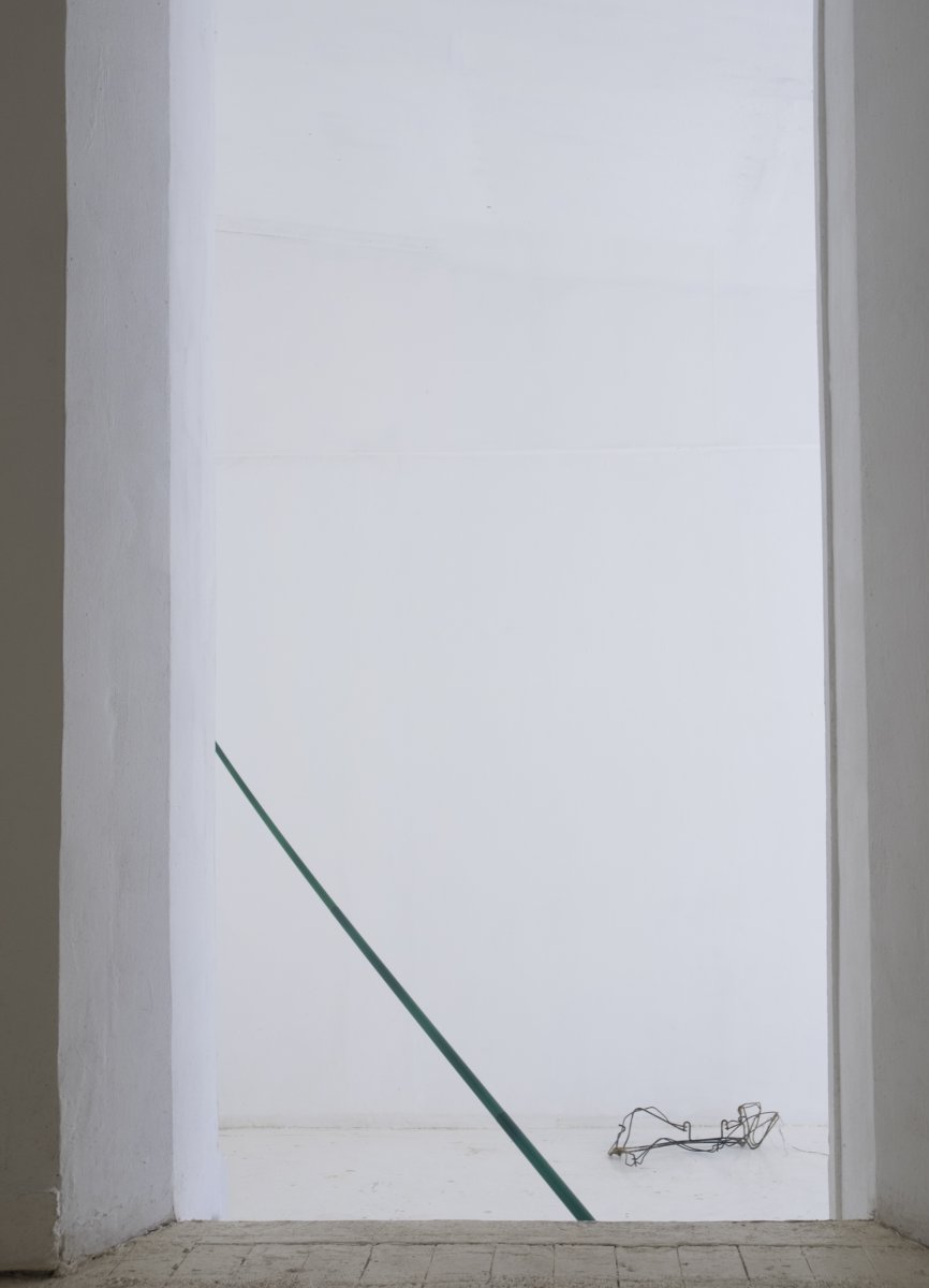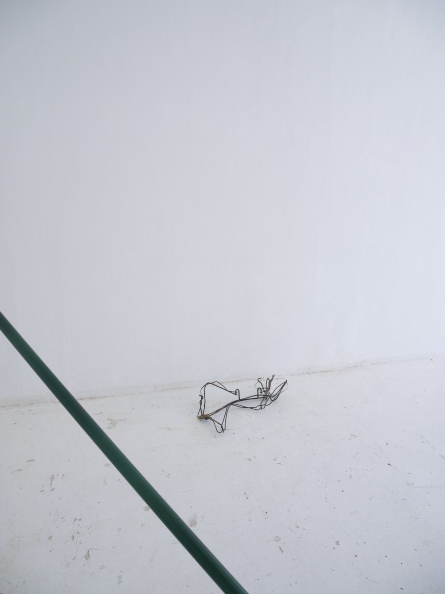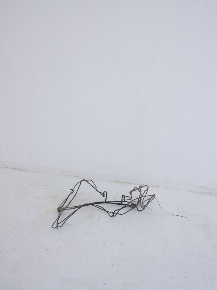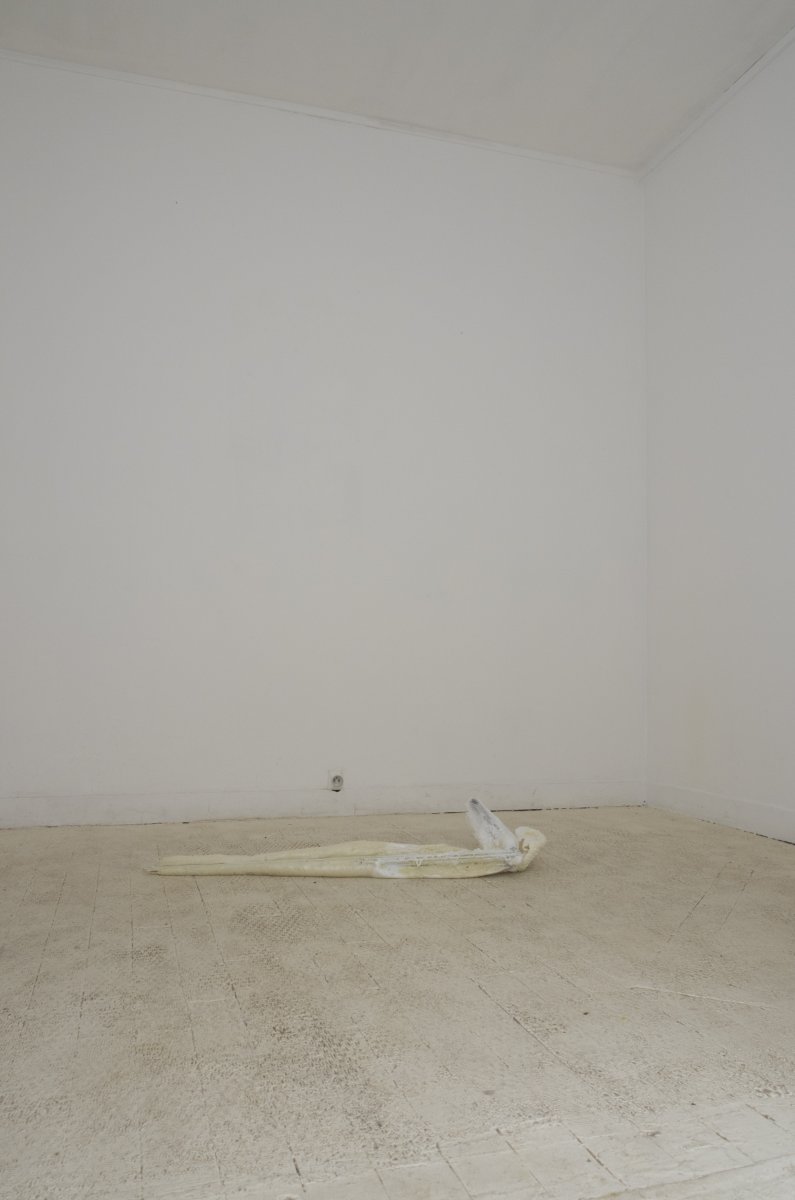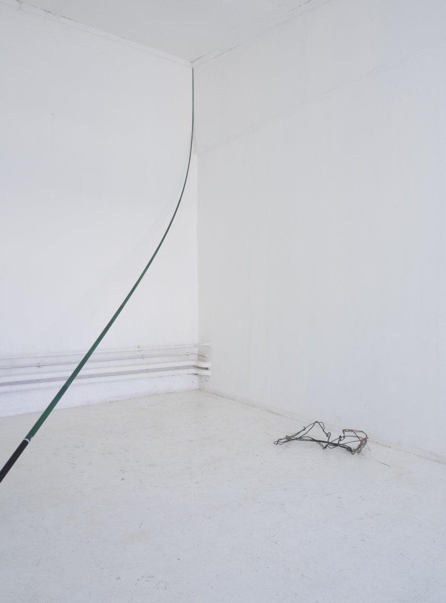 On peut donc s’en tenir à quelques informations stables : l’exposition s’intitule Cayenne : c’est le nom de la chienne du garagiste, juste à côté de la maison. C’est aussi le nom d’une ville, d’une voiture de luxe et d’un piment. Quatre sculptures, de nature et d’échelle différentes y sont installées. Elles ne semblent pas entretenir de relations particulières avec les éléments listés ci-dessus, mais s’il vous prend l’envie d’en faire émerger, personne ne vous jugera. Sans trop entrer dans les détails, vous remarquerez que l’espace (le lieu dans sa globalité, ce qui lie ou éloigne les pièces entre elles, ou avec nous) a été traité avec considération – c’est un aspect non négligeable de la pratique de l’artiste. Pour le reste, j’aime que ses pièces mettent toujours en échec ce que l’on pourrait vouloir en dire. Cela tient à leur relative pauvreté je crois. Au fait qu’elles se donnent à voir sans aucun artifice, mais peut-être pas sans pudeur.