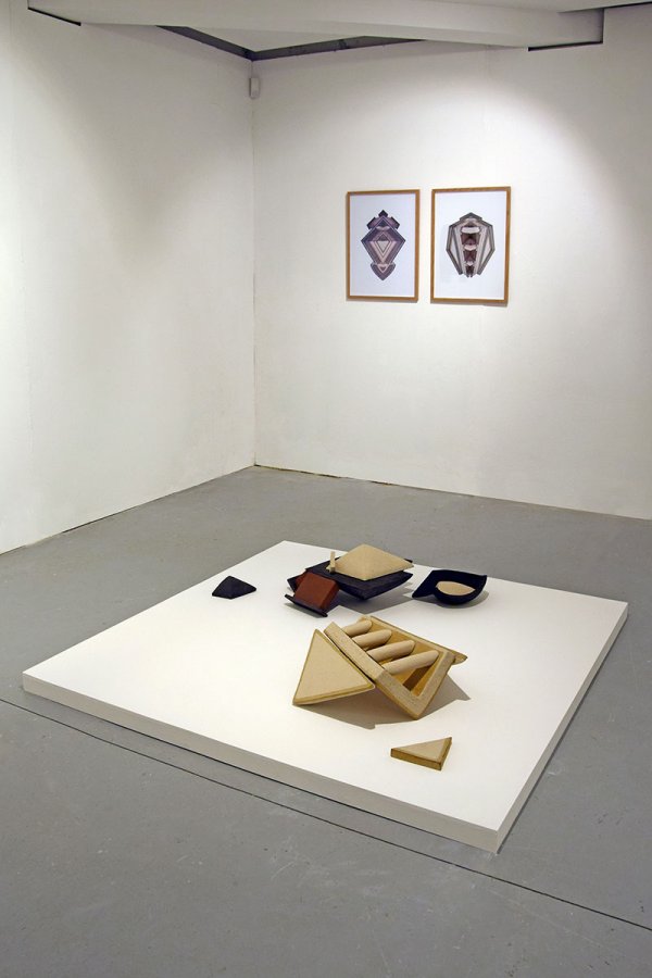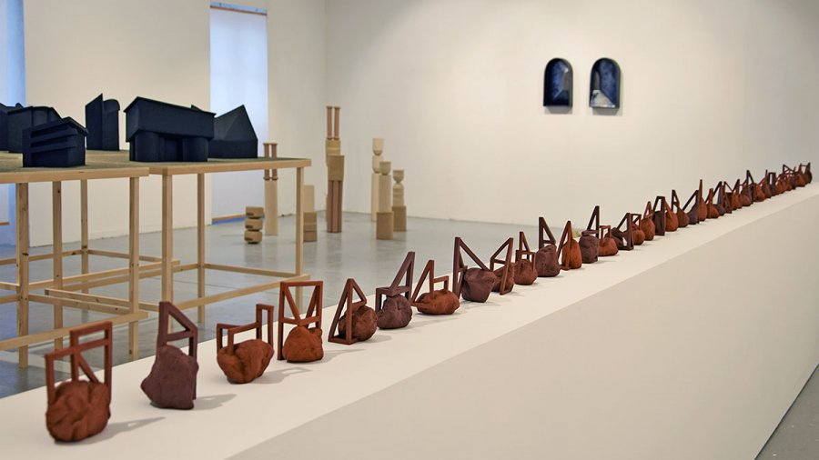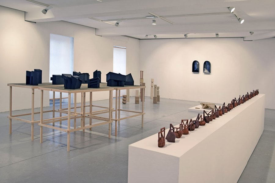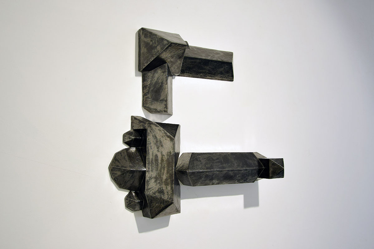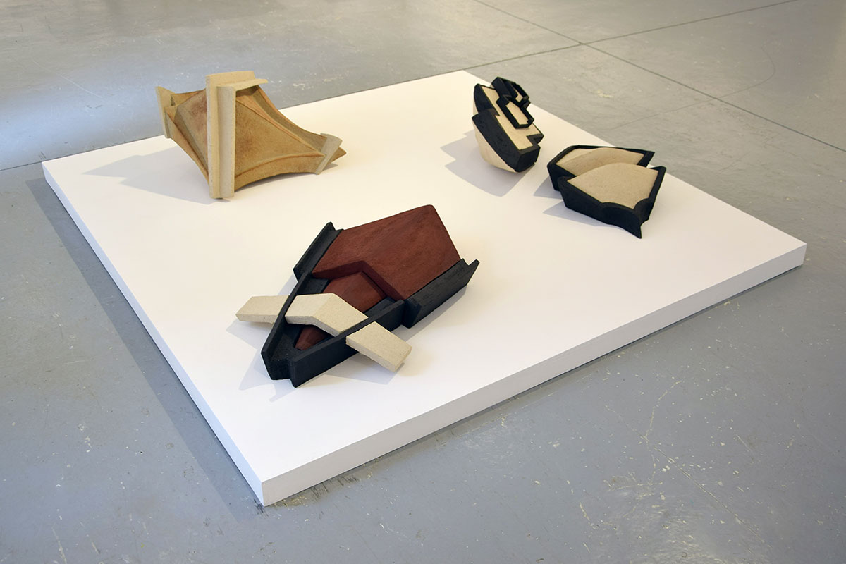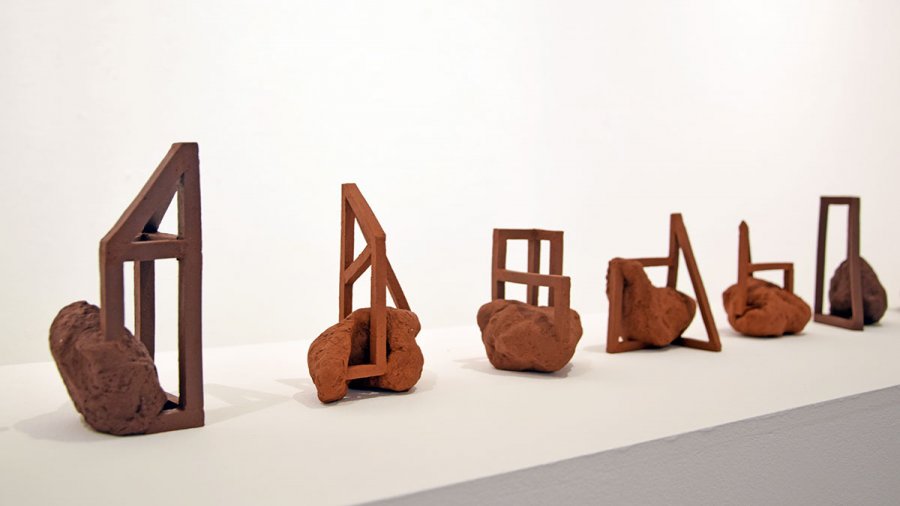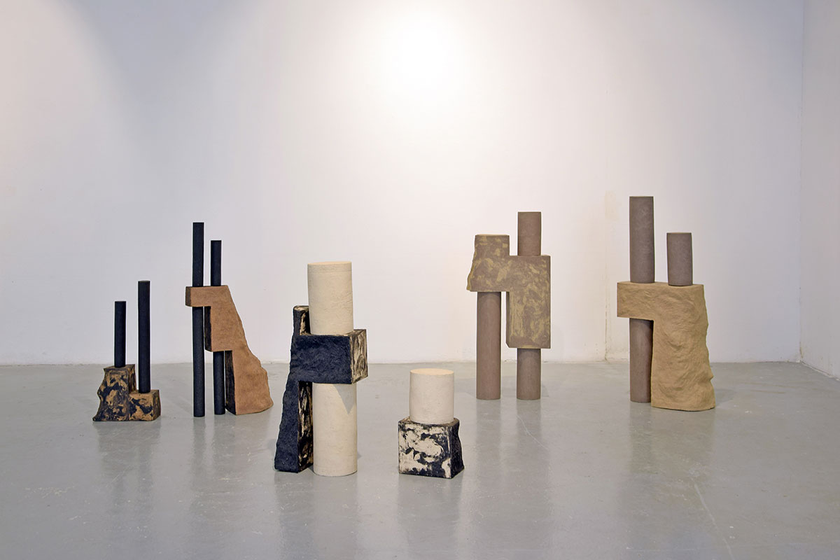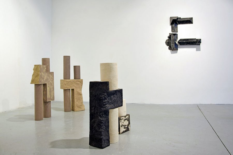 Ni vraiment ceci, ni probablement cela, ses volumes campent dans un entre-deux où la forme sous l’effet du geste, corrigée par la résistance du matériau, émerge avant que le projet accompli par sa finition, prenne de la distance et bascule dans la majesté de l’oeuvre. Pour éviter ce risque de crispation formelle l’artiste travaille en direct, à partir d’une idée générale, sur des formats réduits, dans l’esprit de la maquette, proche de l’ébauche, retenant le volume du côté du signe, matérialisant le concept, sans le rigidifier dans une enveloppe qui deviendrait la seule possible. Ce parti pris de se tenir en deçà, permet à l’artiste de questionner plus librement les aspects fondamentaux de la sculpture : de l’émergence de la forme pensée et façonnée à partir d’une gangue de matière, en passant par la colonne, expression de la troisième dimension, jusqu’aux relations que celle-ci entretient avec l’architecture.