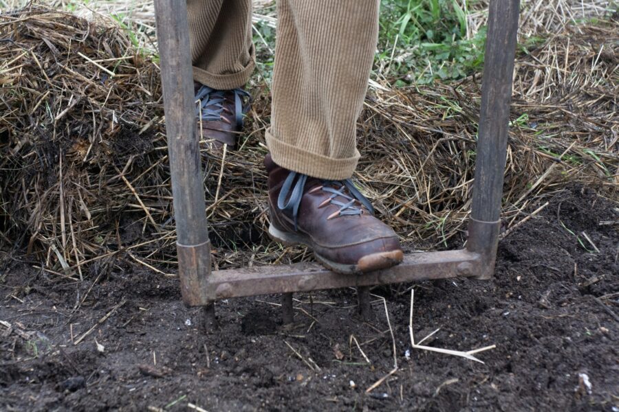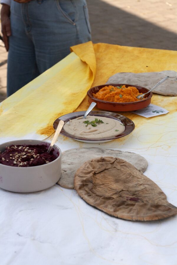 “(..) on a écrasé des kilos de pommes de terre avec du beurre salé, de l’ail et du persil. On les a mangés sans attendre dans des cornets que l’on a fabriqués. On a dessiné d’autres pommes de terre, que l’on a mises en terre. On a attendu qu’elles poussent avant de les récolter quatre-vingt-dix jours plus tard pour les faire cuire dans la braise.On a cousu des sacs à patates dans de la toile de jute pour faire la course avec, et sur chacun de ces sacs, on a brodé une pomme de terre. Inspiré·es par le chilal de l’épicerie, on en a fait tout un fromage en chauffant des litres de lait cru, que l’on a fait cailler, pour ensuite filer et étirer la pâte à plusieurs. On a pressé le jus des agrumes et des carottes, et avec le marc et du curcuma, on a teint de grands tissus, que l’on a fait sécher au vent. On a brodé dessus des zones entières pour adoucir les lignes de démarcations. Les bottes aux pieds, on a marché dans la petite Amazonie, on en a rapporté des images en mouvement et on a imaginé la raconter aux autres habitant·es en une bouchée. On a aussi pétri du pain pour le faire cuire dans une oeuvre d’art de l’autre côté de la Loire.”