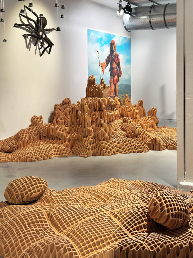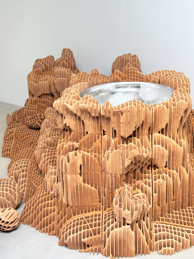A peine atterris, nous cheminons parmi les îles pétrifiées du sculpteur Vincent Mauger, dans un monde accidenté et toujours en mouvement. Face au sanctuaire blanc érigé par Justine Bougerol, nous basculons dans une brèche, un trou noir vertigineux, vers le point d’émergence du chaos. Tentons, en observant l’œuvre aérienne et nébuleuse du designer Arthur Hoffner, de saisir le mystère du Big Bang et de la naissance de la vie.