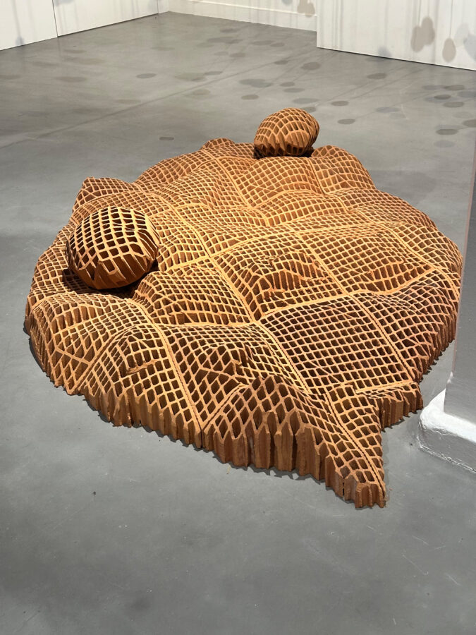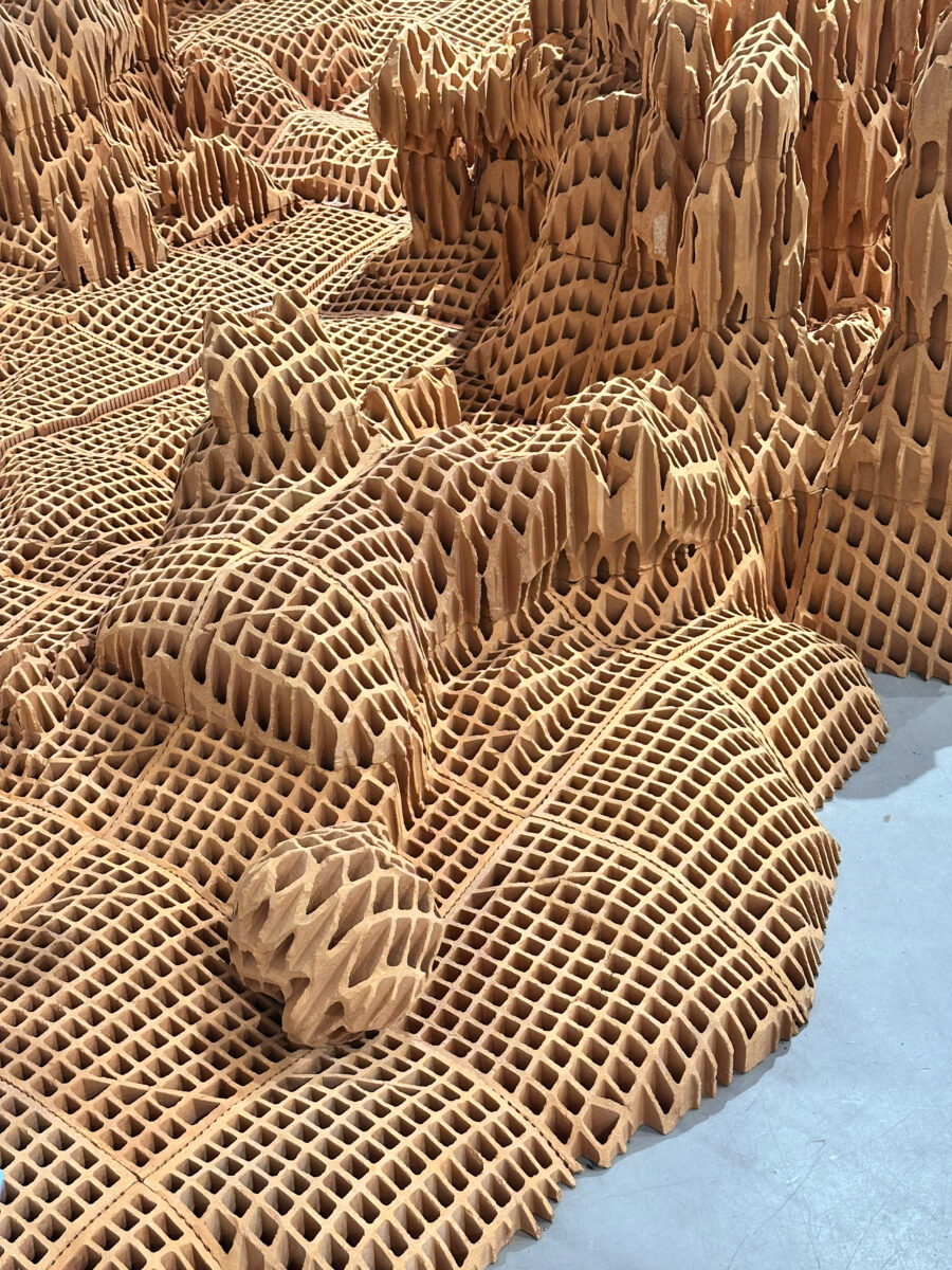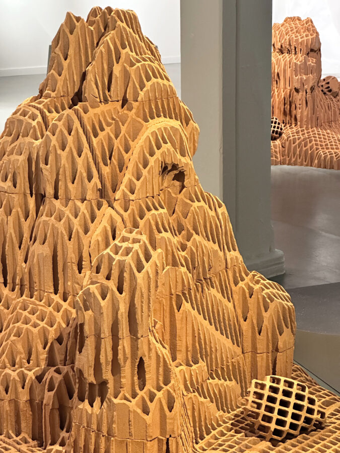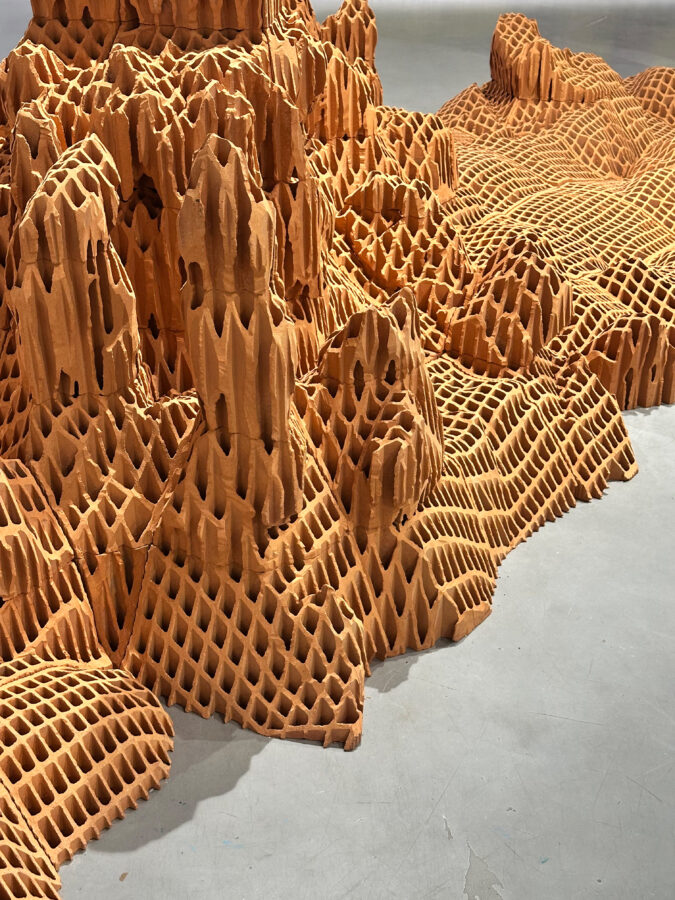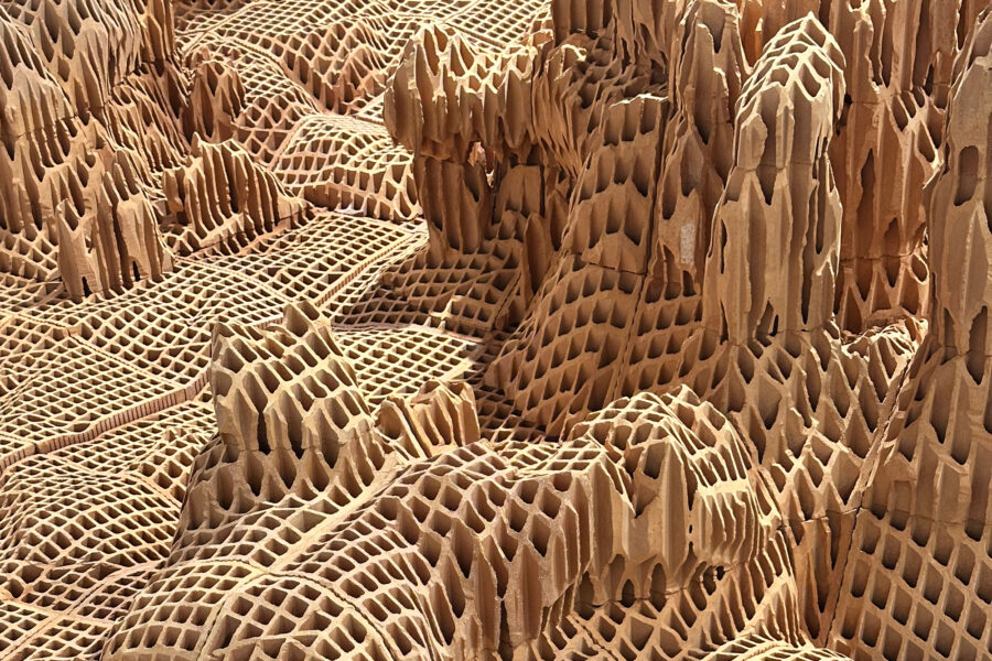 Vincent Mauger s’intéresse à ce avec quoi l’on (se) construit. À partir de matériaux bruts, il sculpte des surfaces accidentées et incertaines. Continents engloutis, rêveries pétrifiées ou vestiges dont on cherche à identifier les contours, ce chapelet d’îles faites de briques évoque un monde en constante évolution et à l’équilibre précaire. En parcourant ce territoire tout à la fois détruit et construit, familier et étranger, l’artiste fait vaciller nos certitudes et nous invite à faire l’expérience de notre appartenance à une planète unique.