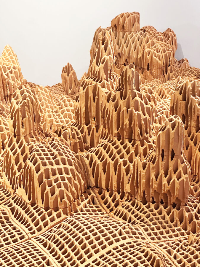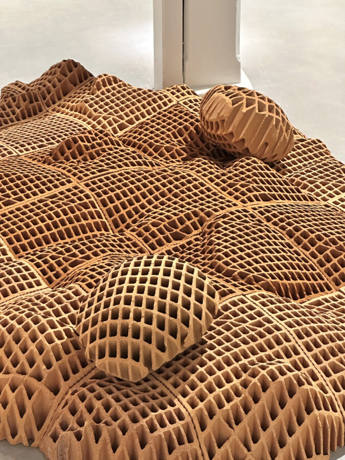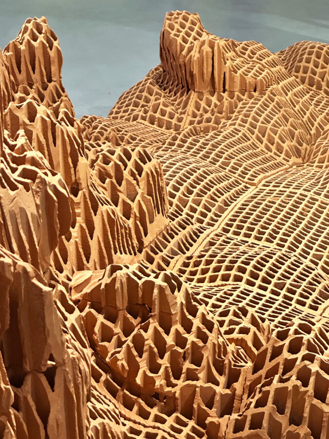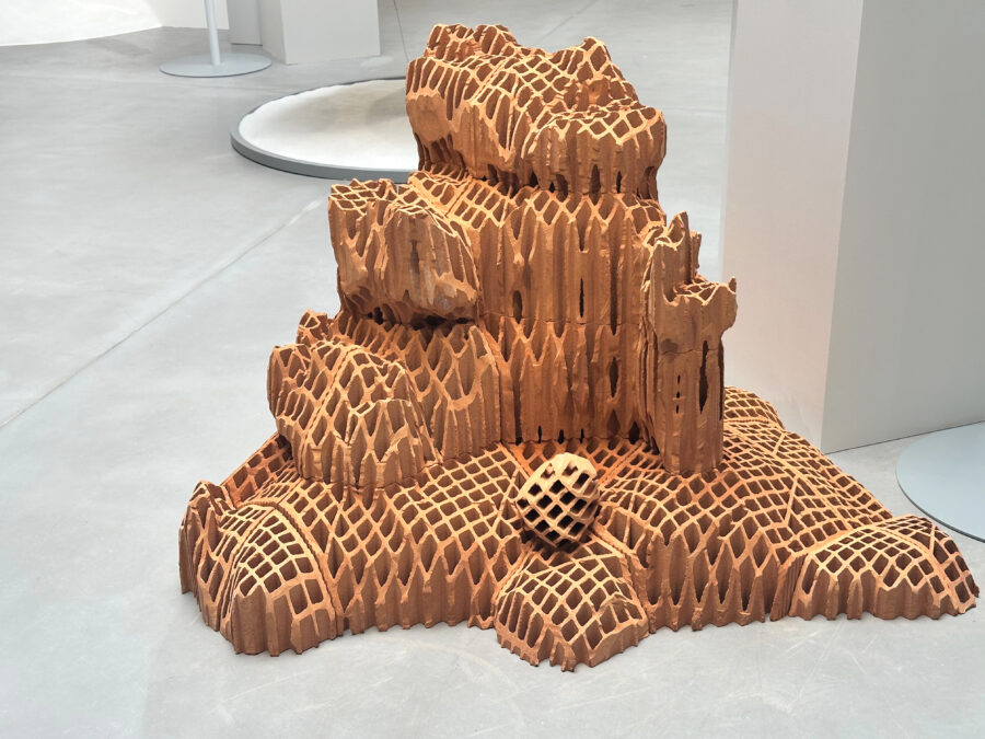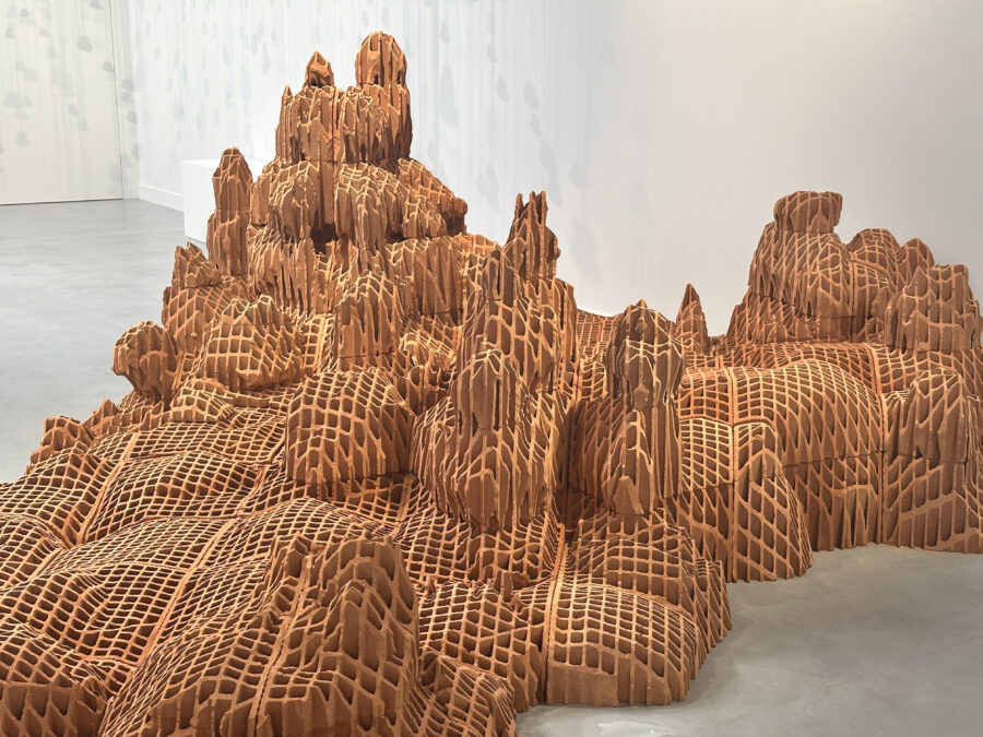 Vincent Mauger s’intéresse à ce avec quoi l’on (se) construit. À partir de matériaux bruts, il sculpte des surfaces accidentées et incertaines. Continents engloutis, rêveries pétrifiées ou vestiges dont on cherche à identifier les contours, ce chapelet d’îles faites de briques évoque un monde en constante évolution et à l’équilibre précaire. En parcourant ce territoire tout à la fois détruit et construit, familier et étranger, l’artiste fait vaciller nos certitudes et nous invite à faire l’expérience de notre appartenance à une planète unique.