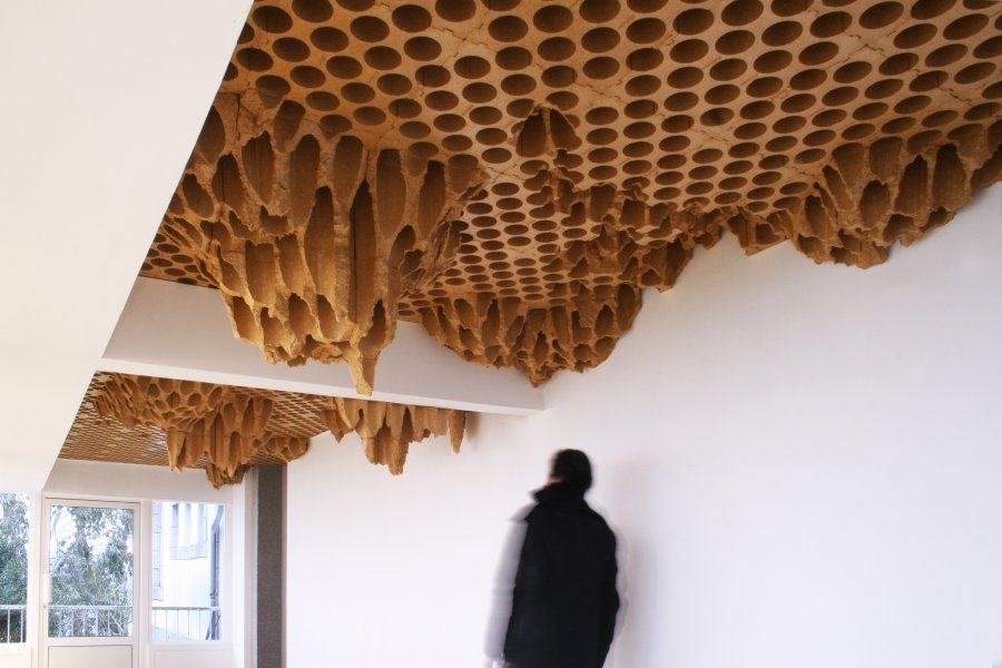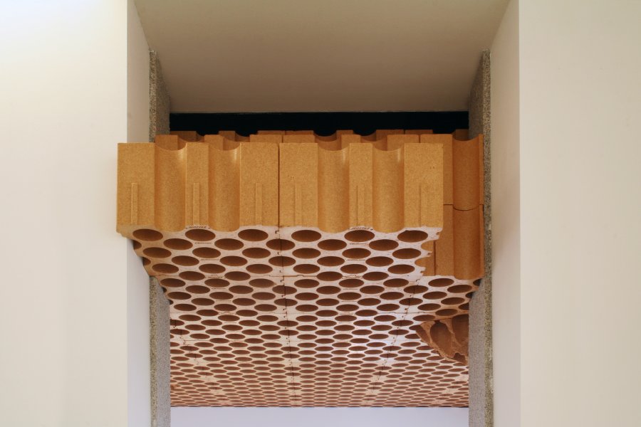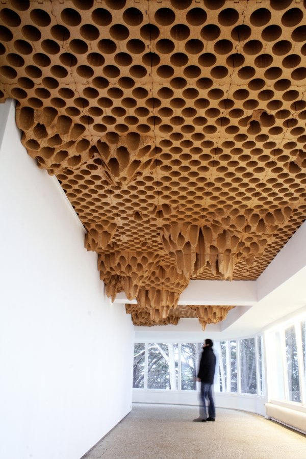 Que tout puisse basculer, nos repères constitutionnels comme nos paysages familiers, I’ installation de Vincent Mauger tend à le suggérer. Dans le long couloir vitré qui dessine l’entrée de la galerie et cadre le panorama côtier comme un immense tableau, l’artiste tapisse le plafond de blocs de polystyrène compacts initialement conçus pour servir de casiers à bouteilles, d’où le titre de l’œuvre en forme de clin d’œil : Château Millésime. Ce matériau ocre, percé régulièrement de formes circulaires, est sculpté aléatoirement pour libérer des escarpements imprévisibles, des strates qui désorientent les sens et dialoguent en direct avec la nature alentour. À la fois organiques et minéraux, ces reliefs rêches compilent les référents : stalactites brunes, alvéoles de ruche, cristaux de gypse, massifs coralliens ou champignons parasites prolifèrent dans l’écrin blanc de la galerie, comme si I’ architecture subissait de bien étranges métamorphoses. « Toute œuvre d’art est une possibilité permanente de métamorphose, offerte à tous les hommes. « (1) Chacun à sa manière, Franck Bragigand, Baptiste Debombourg et Vincent Mauger portent l’intime conviction que I’ art a ce pouvoir de révéler, en un monde qui chancelle, de nouveaux équilibres. En ce sens, I’ effet papillon qui se cache derrière le titre de ces deux expositions (2) leur sied vraiment bien, soit la métaphore de l’art comme amplificateur d’infimes variations du geste individuel qui peuvent aller jusqu’à provoquer des bouleversements planétaires.