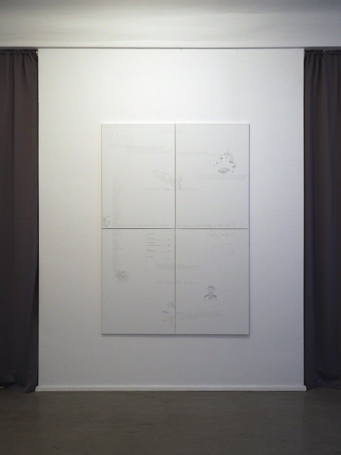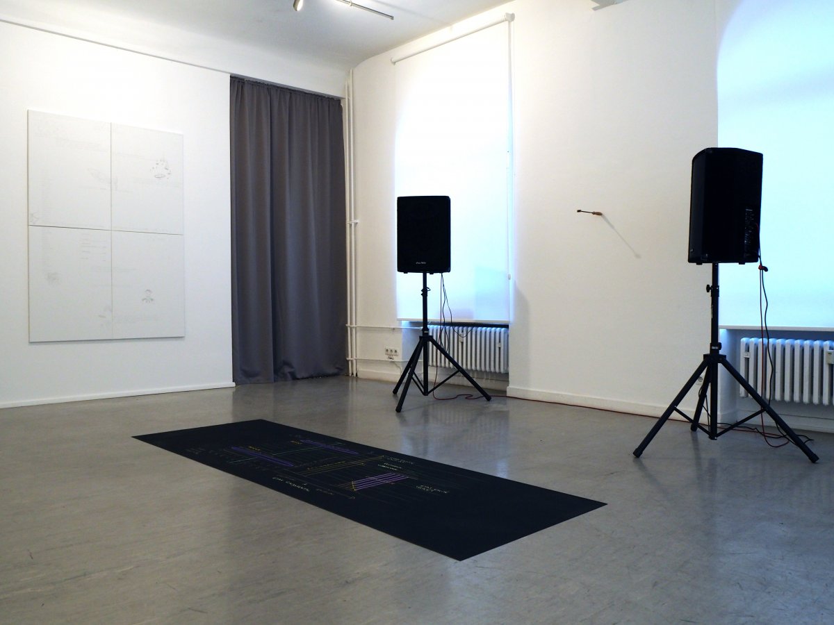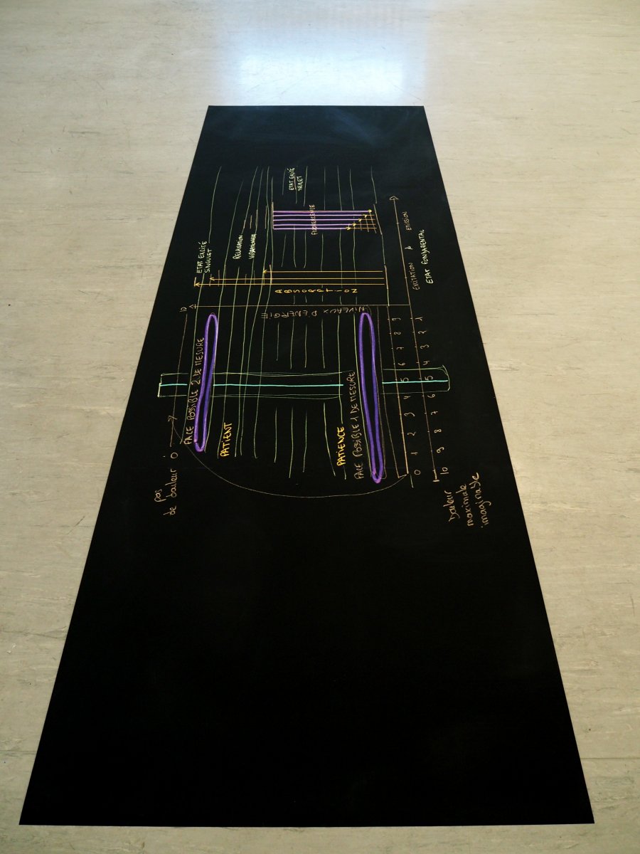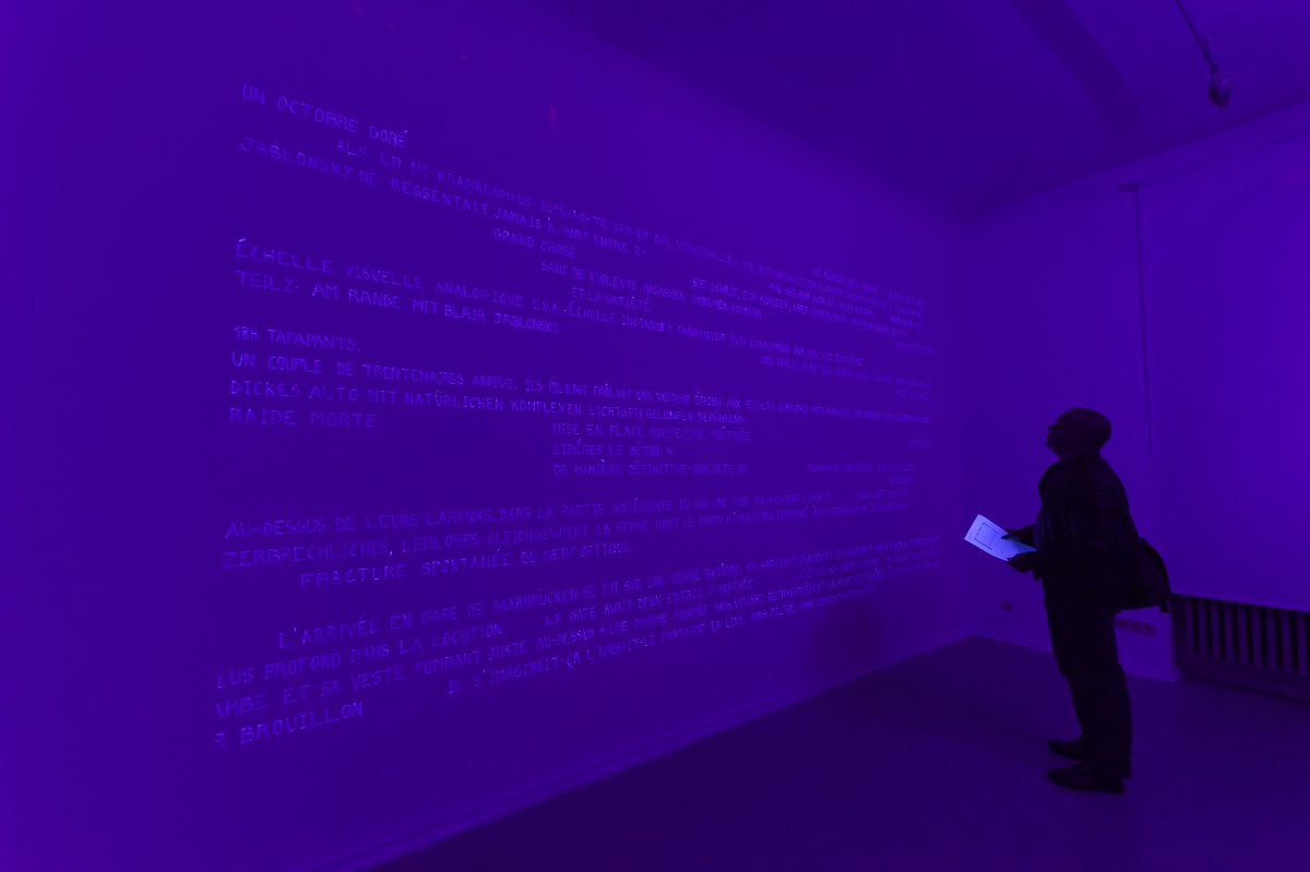La question de la fluorescence et de la longueur d’onde de la lumière est au centre de l’installation. Une partie de l’espace d’exposition est entièrement éclairés avec des ampoules UV, placés à différents endroits et hauteurs.Elles se déclenchent quand le spectateur entre dans la salle. Des mots, des phrases, extraites du récit sont dispersés dans l’espace, peints avec de la peinture fluorescente invisible. Comme autant d’indices qu’ils ne restent plus qu’à relier.