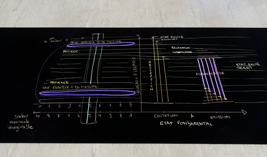 J’ai également écrit une chanson pour le personnage principale Blair Jablonski « expert en fluorescence et en art contemporain ». Il emprunte son nom à Alexandre Jablonski qui développa la fluorescence dans les années 1920. Le diagramme de Jablonski représente le transfert d’énergie entre molécules fluorescentes. J’ai réalisé un dessin qui est une interprétation poétique du diagramme de Jablonski. Il est combiné avec l’échelle visuelle analogique (E.V.A) qui permet de mesurer l’intensité de la douleur.
