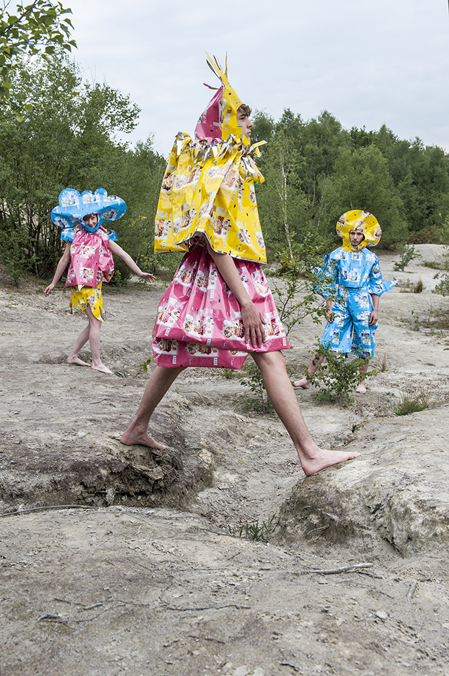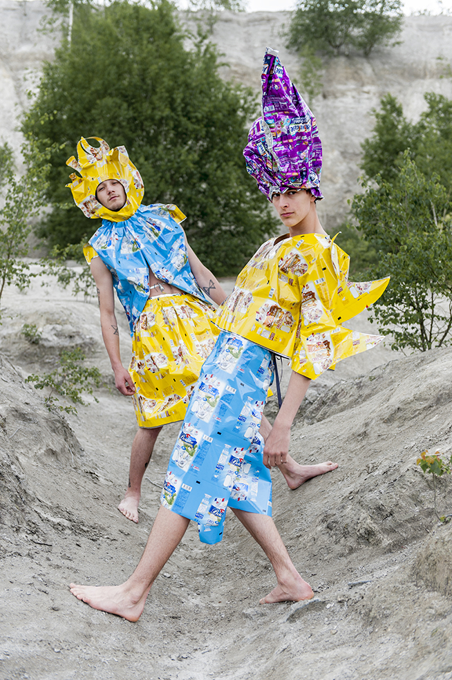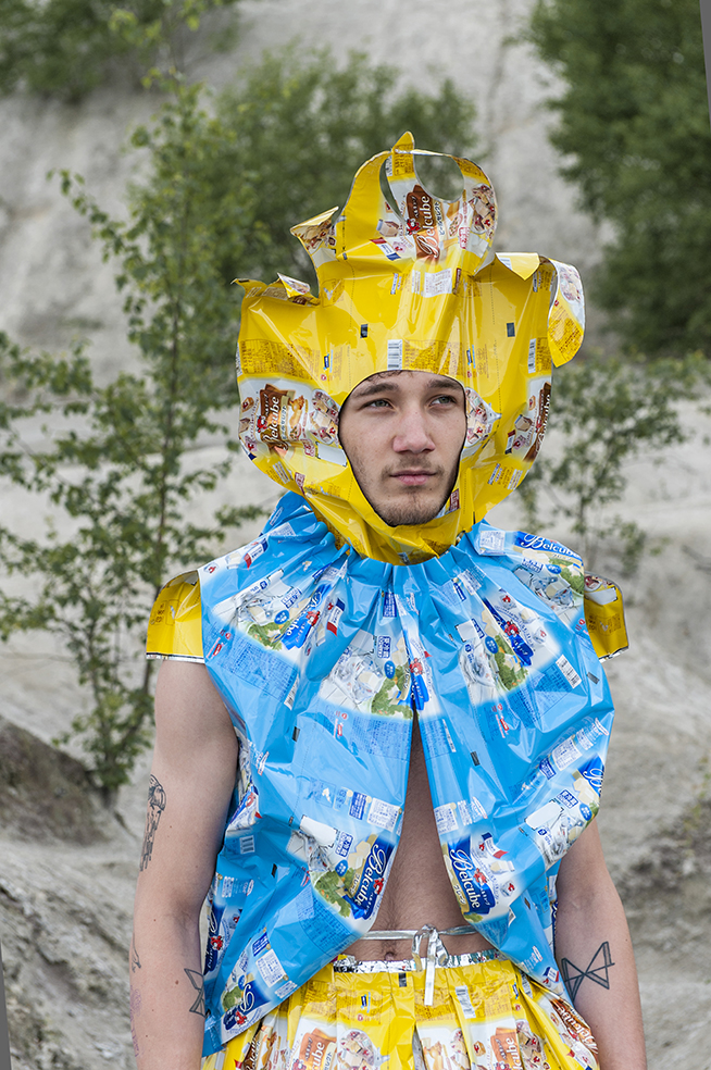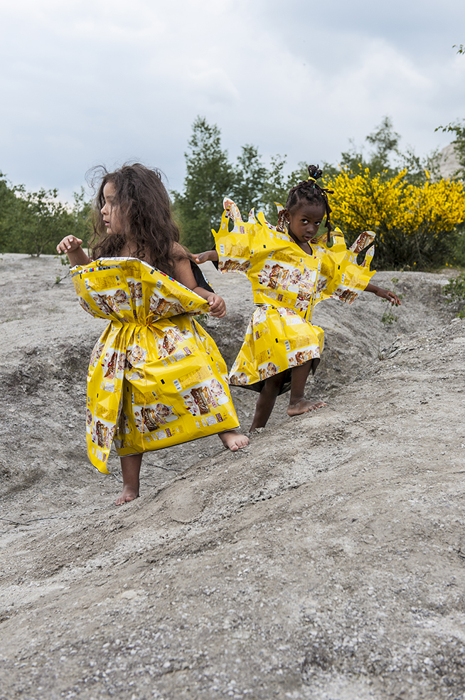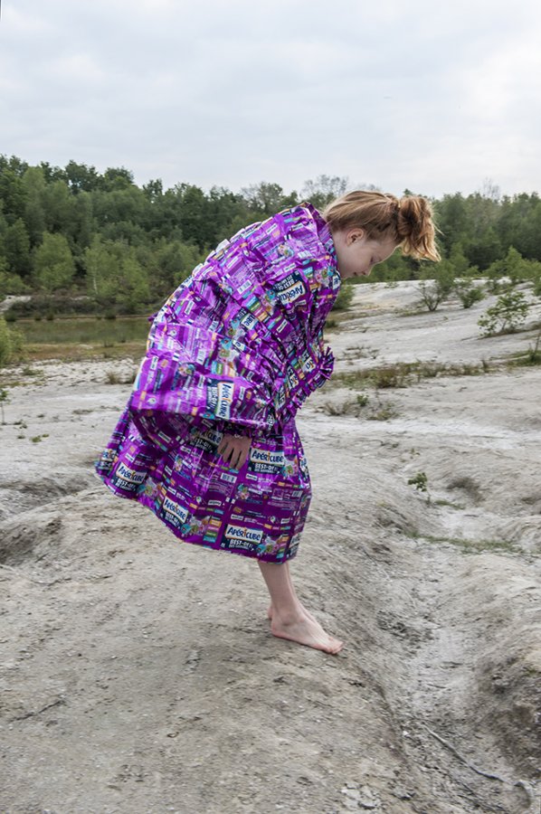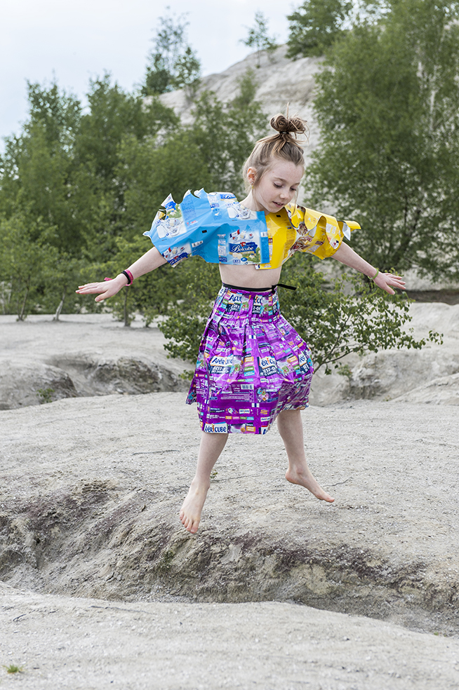 J’ai imaginé une collection simple, facile à essayer et multi taille pour permettre à chacun de jouer le jeu. Elle valorise les coloris et le graphisme des emballages, se joue de la tenue et du son de la matière.