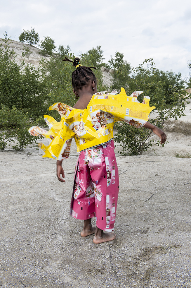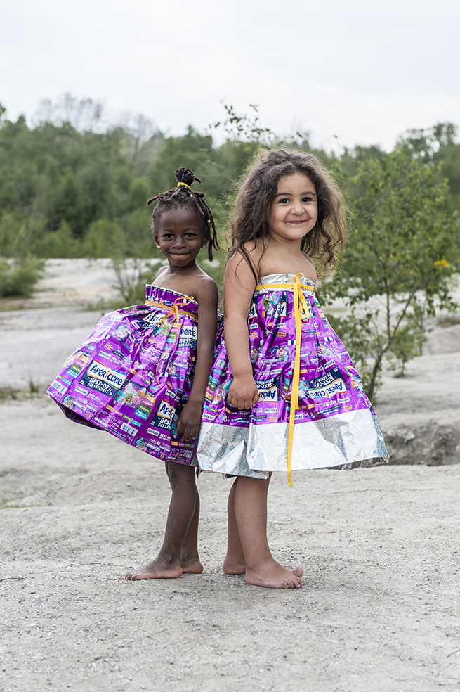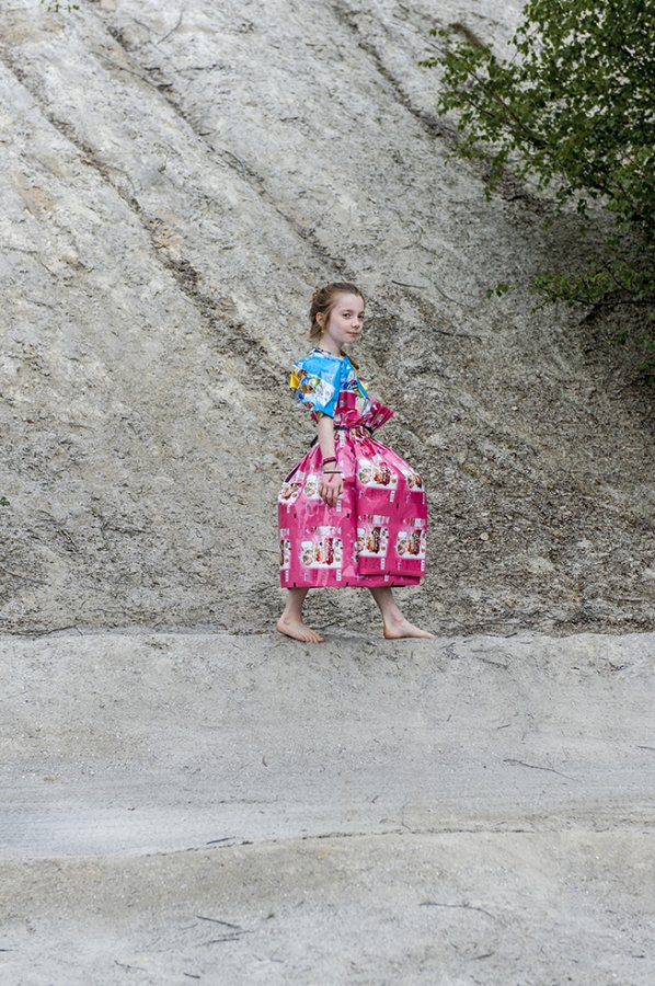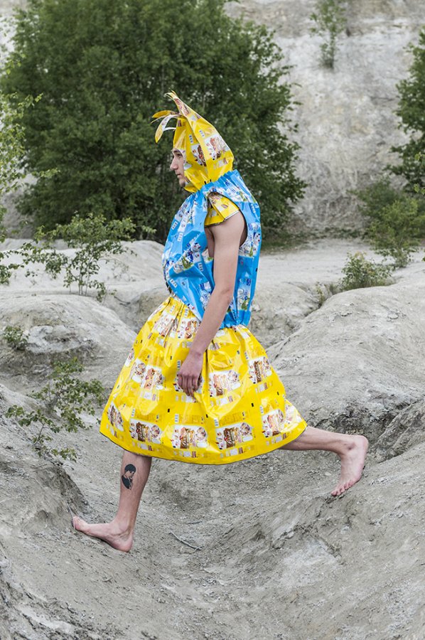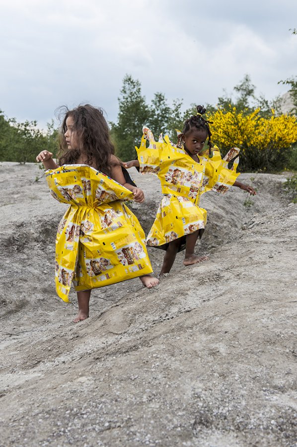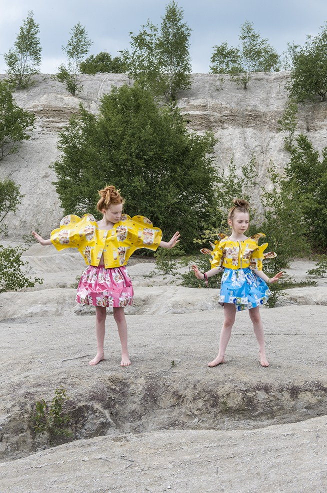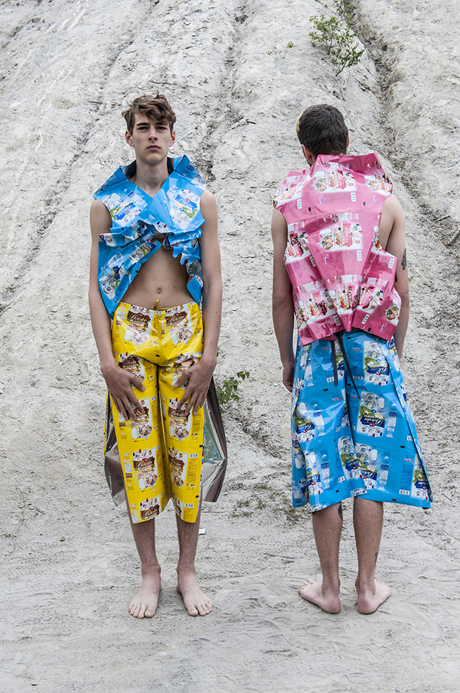 J’ai imaginé une collection simple, facile à essayer et multi taille pour permettre à chacun de jouer le jeu. Elle valorise les coloris et le graphisme des emballages, se joue de la tenue et du son de la matière.