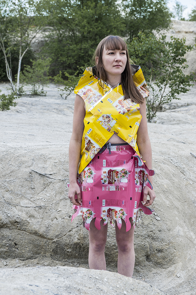 Le matériau très technique de l’emballage est découpé au laser et soudé avec une machine de technologie nouvelle à ultra son : la Nucléus, en partenariat avec le lycée Heinlex de Saint-Nazaire. Renouant avec la tradition de la maille, les robes et débardeurs sont tricotés par les habitantes de la région de Lons-le-Saunier.