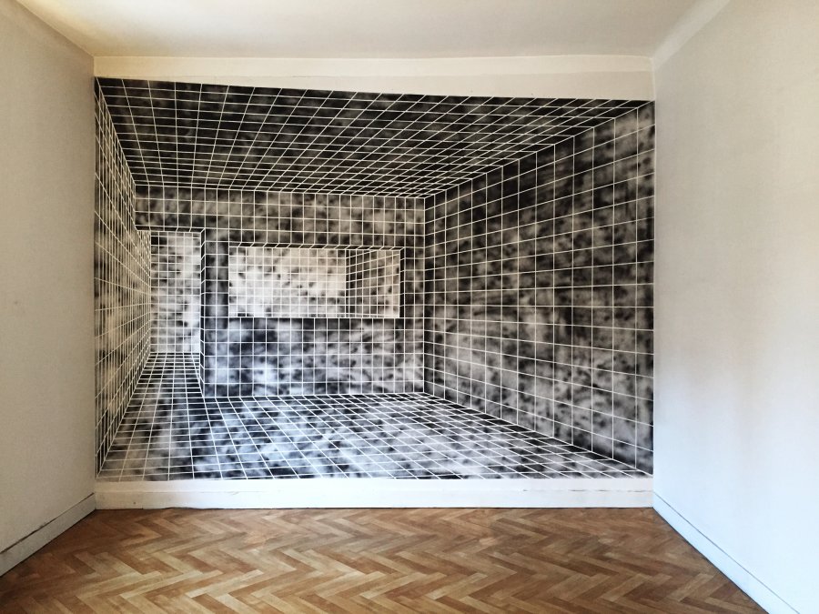 Cette peinture mural à été réalisé suite à une invitation du collectif Nantais Open it, à participer à une exposition collective en novembre 2017. Le collectif Open it a pour particularité de faire des expositions dans des lieux en transition, ici une maison avant travaux et totalement vide de mobilier. Pour ce contexte particulier j’ai proposé de travailler sur un mur du salon et d’y peindre au pochoir un dessin extrait d’une série sur l’architecture. Cette grande peinture mural reprend exactement le format du mur, et se propose comme un trompe l’œil, mais également comme une ouverture sur un autre espace. Dans cette maison vidée de tout ornement, il est offert au spectateur, un point de vue sur un espace lui même inoccupé. Les lieux vides sont des lieux que nous habillons. Ici le mur se revêt d’un autre espace aussi nu que lui, comme un écho à sa propre solitude.