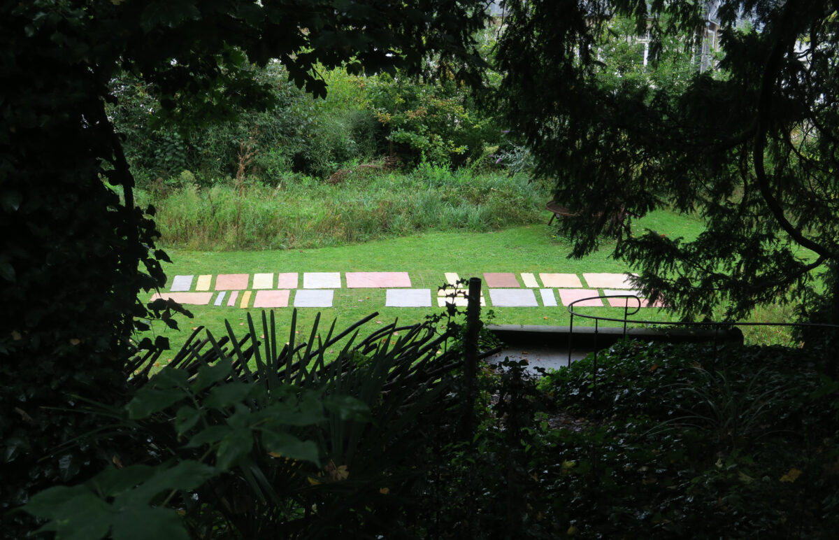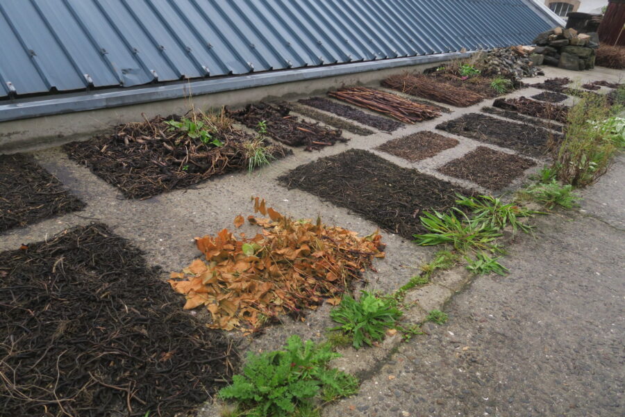 Des tas de matières végétales sont déposés à l’entrée du jardin sur une dalle en béton. Des racines, rhizomes, tiges et bulbes de plantes du jardin y sont rangées soigneusement. L’échelle du corps, l’envergure des bras et la taille des déchets végétaux déterminent la forme et la dimension de chaque tas. Le tout dessine La Mosaïque des tas. Elle vit au fil des saisons : ses couleurs changent, la matière se transforme.