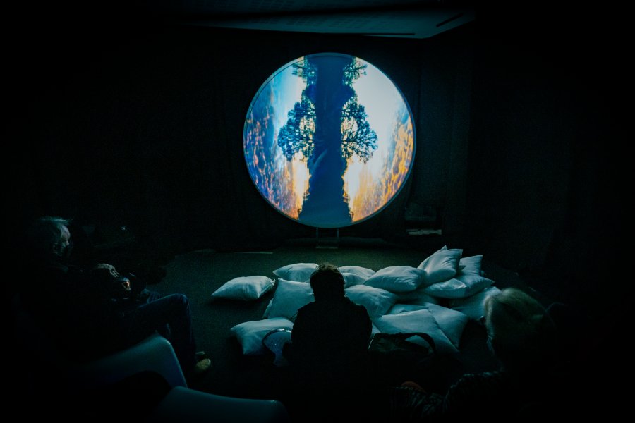Dans un cercle en bois de 2m.25 de diamètre, une nature en perpétuelle métamorphose est projetée en boucle. La bande-son contient des fréquences curatives, destinées à délier les tensions du corps, aux vertus réparatrices.