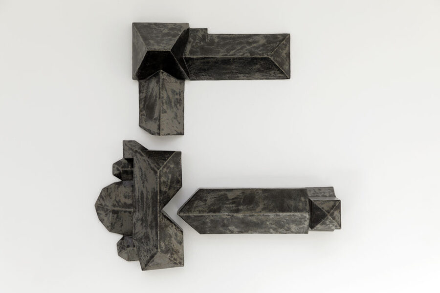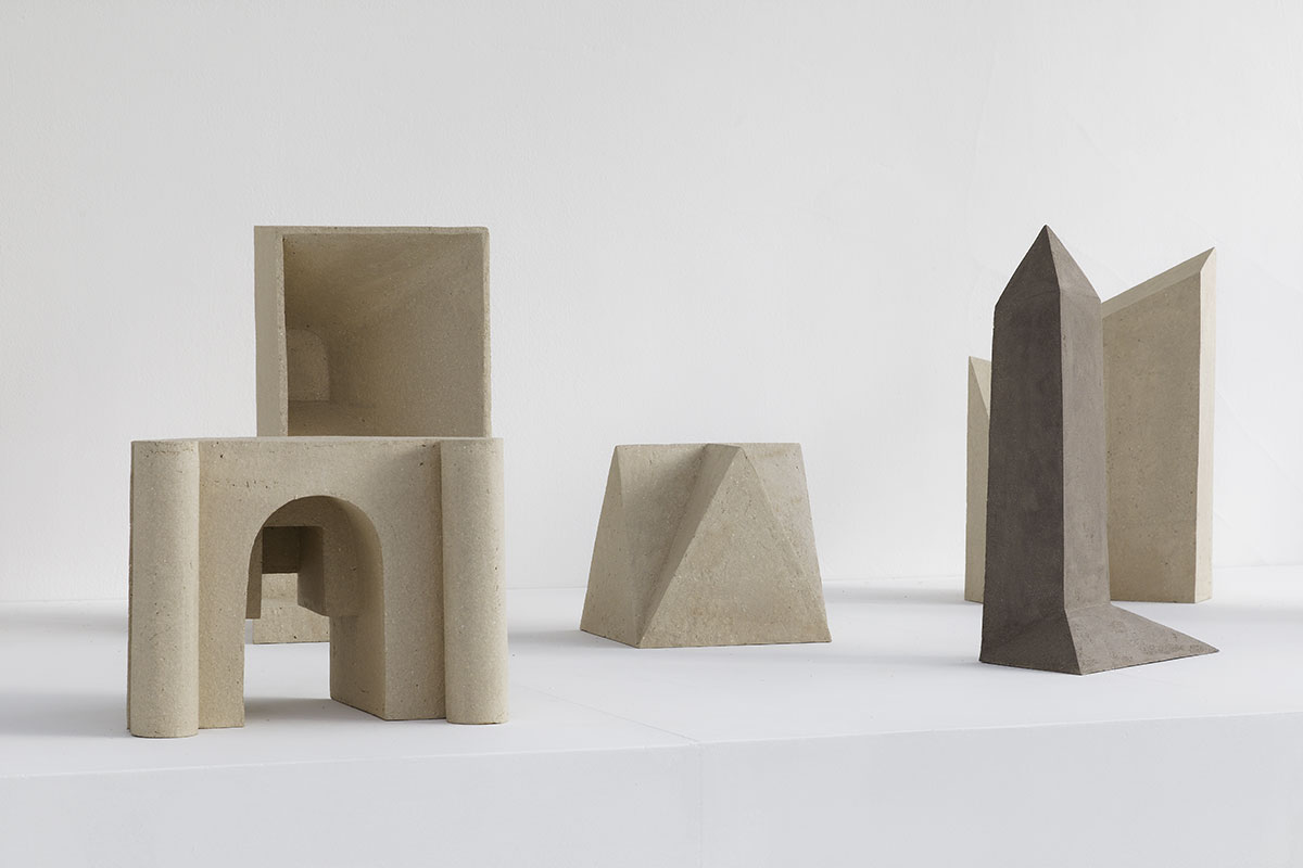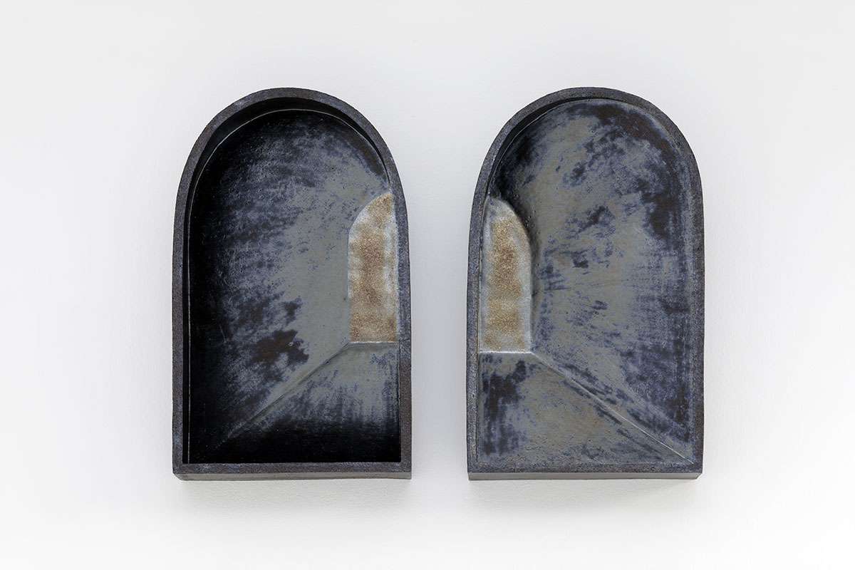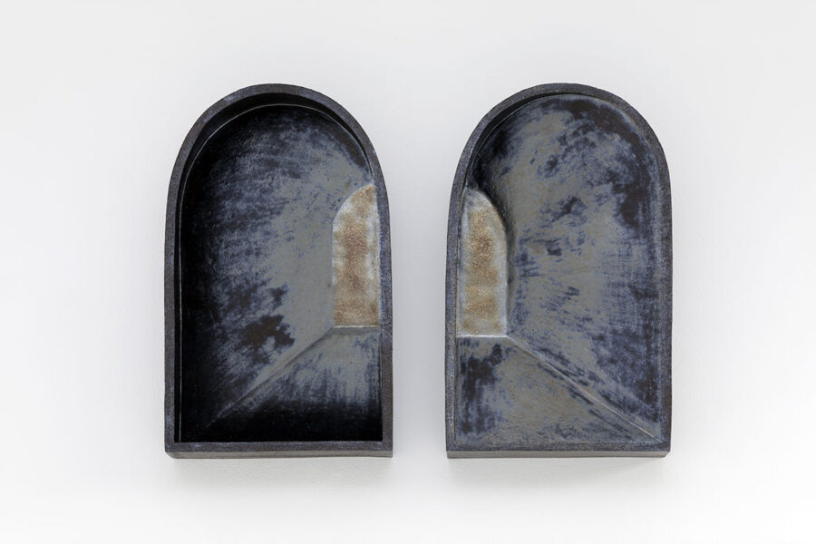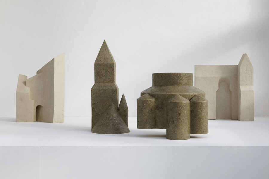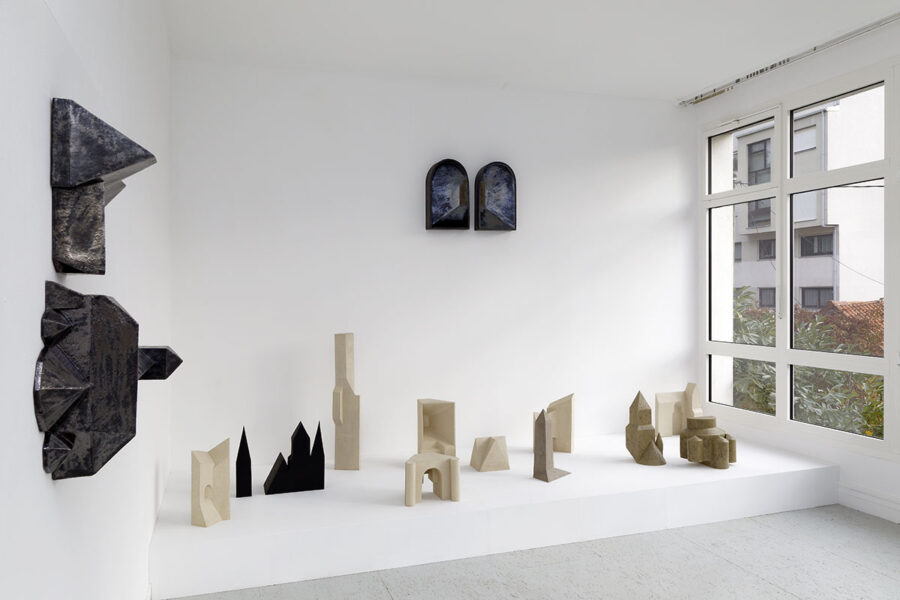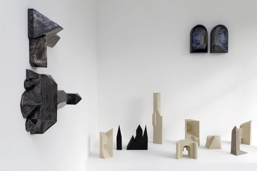 L’univers des cinq artistes de l’exposition confine autour de la notion de vestige, qui, en latin « Vestigium », signifie « la trace de pied ». On songe à cette allusion à l’empreinte, trace laissée par un corps pressé sur une surface, dans le modelé des oeuvres de Valérie Delarue. On retrouve aussi l’idée de vestige dans les architectures, traces d’une histoire que l’oeuvre Bérengère bâtit. Ghislaine Vappereau qui associe le mélaminé, matériau industriel, à la céramique, revisite les vestiges de l’époque moderne des années 1940/1980 où cohabitaient des revêtements de cuisines modernes avec les pots en faïence de grand-mère. Le grès chamotté utilisé par Hélène Delépine produit des imperfections de surface, un aspect minéral et contribue à la création de vestiges factices. D’apparence inaccomplies, comme en sursis, les oeuvres d’Hélène Mougin, très organiques se décryptent comme des arrêts sur image, des états transitoires, des vestiges vivants. Enfin, c’est par le mouvement des images qui se construisent et se déconstruisent que le dessin devient vestige fugitif avec Richard Negre.