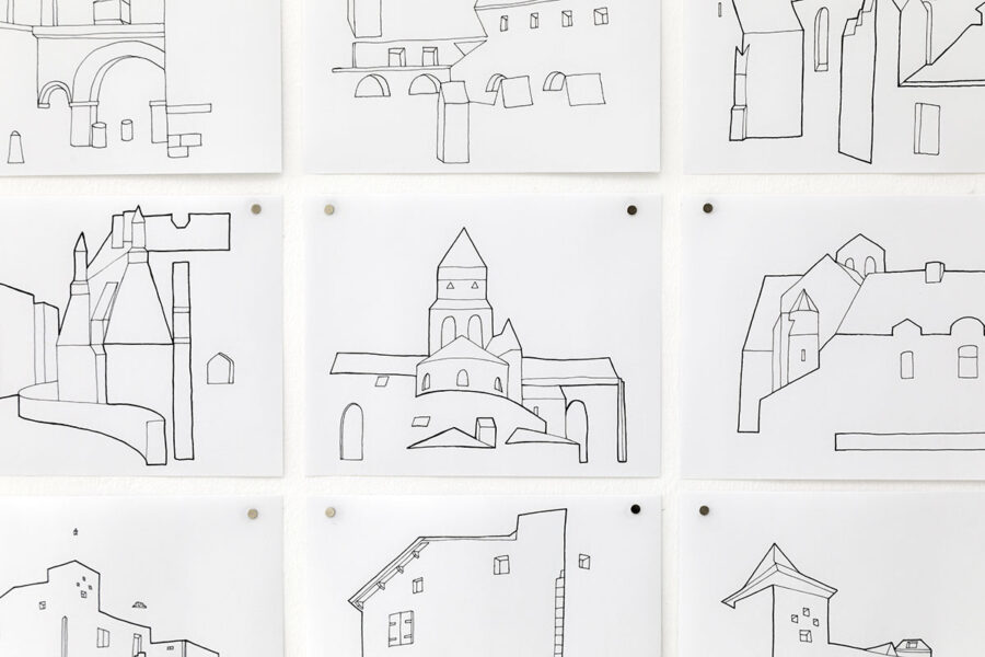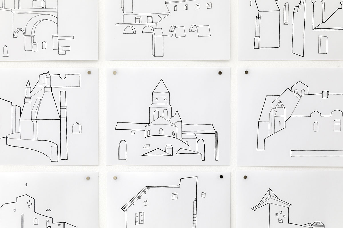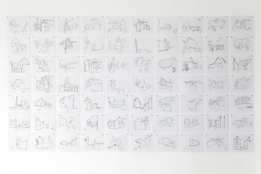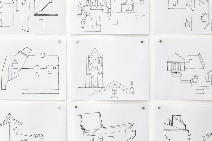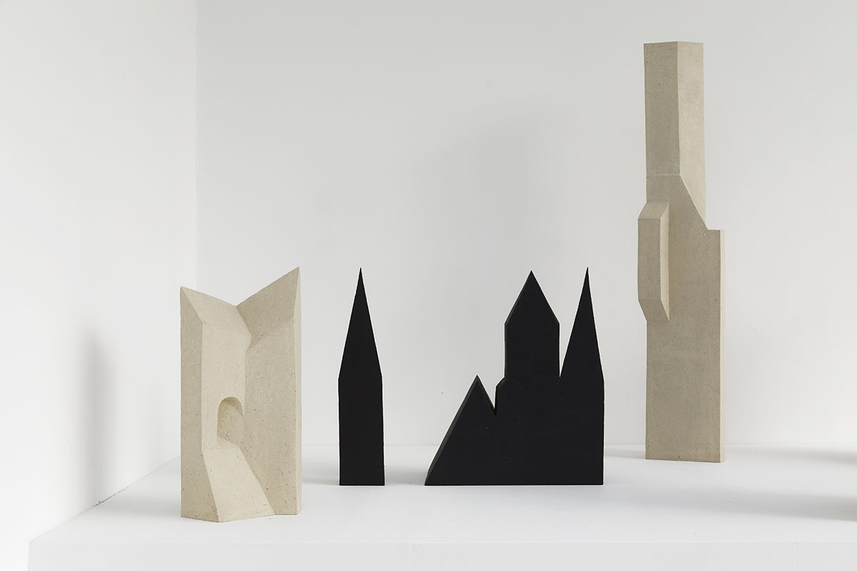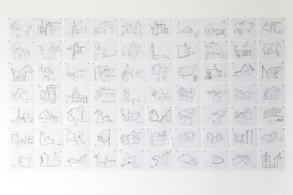 La pratique graphique d’Hélène Delépine alimente la conception de ses volumes en céramique. Le travail préparatoire consiste, pour elle, à exécuter des croquis sur place, en extérieur, face à des constructions. Ses dessins au trait, linéaires, constitués de lignes droites, horizontales, verticales ou diagonales révèlent une forme architecturale, le pourtour d’une façade, la forme d’un toit, d’une ouverture. Elle s’attache uniquement aux lignes de construction et aux proportions du monument sans relever aucun détail architectural. À partir de ces points de vue dessinés en perspective frontale ou cavalière, elle réalise des édifices en terre à une échelle réduite. Sculpter un matériau comme la pierre, c’est enlever de la matière à un bloc plein. En céramique, modeler l’argile, c’est ajouter de la matière au fur et à mesure que l’objet s’élève autour d’un vide. L’argile, grâce à sa plasticité, se malaxe et prend forme. Le fait que la terre, de consistance molle, une fois cuite, devienne aussi dure que la pierre intéresse Hélène Delépine. Cet aspect minéral la conduit à élaborer des volumes architecturaux de forme géométrique simple, façonnés avec des plaques de terre. Les dessins alimentent les lignes de structure et les proportions de la future sculpture. La sobriété des constructions est renforcée par une économie de détails et valorisée par le relief, la profondeur et la lumière. Le répertoire de formes architecturales ainsi créé incite à une réflexion autour du bâtiment banal ou patrimonial. Pour mieux révéler le réel, l’artiste en construit des formes abstraites.