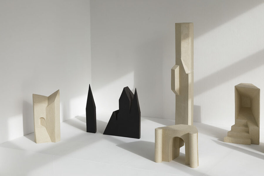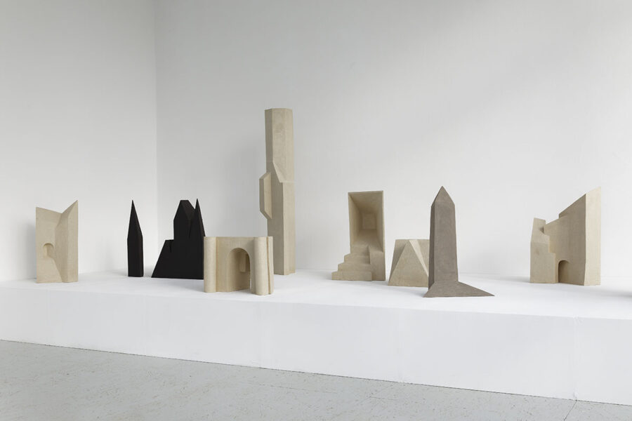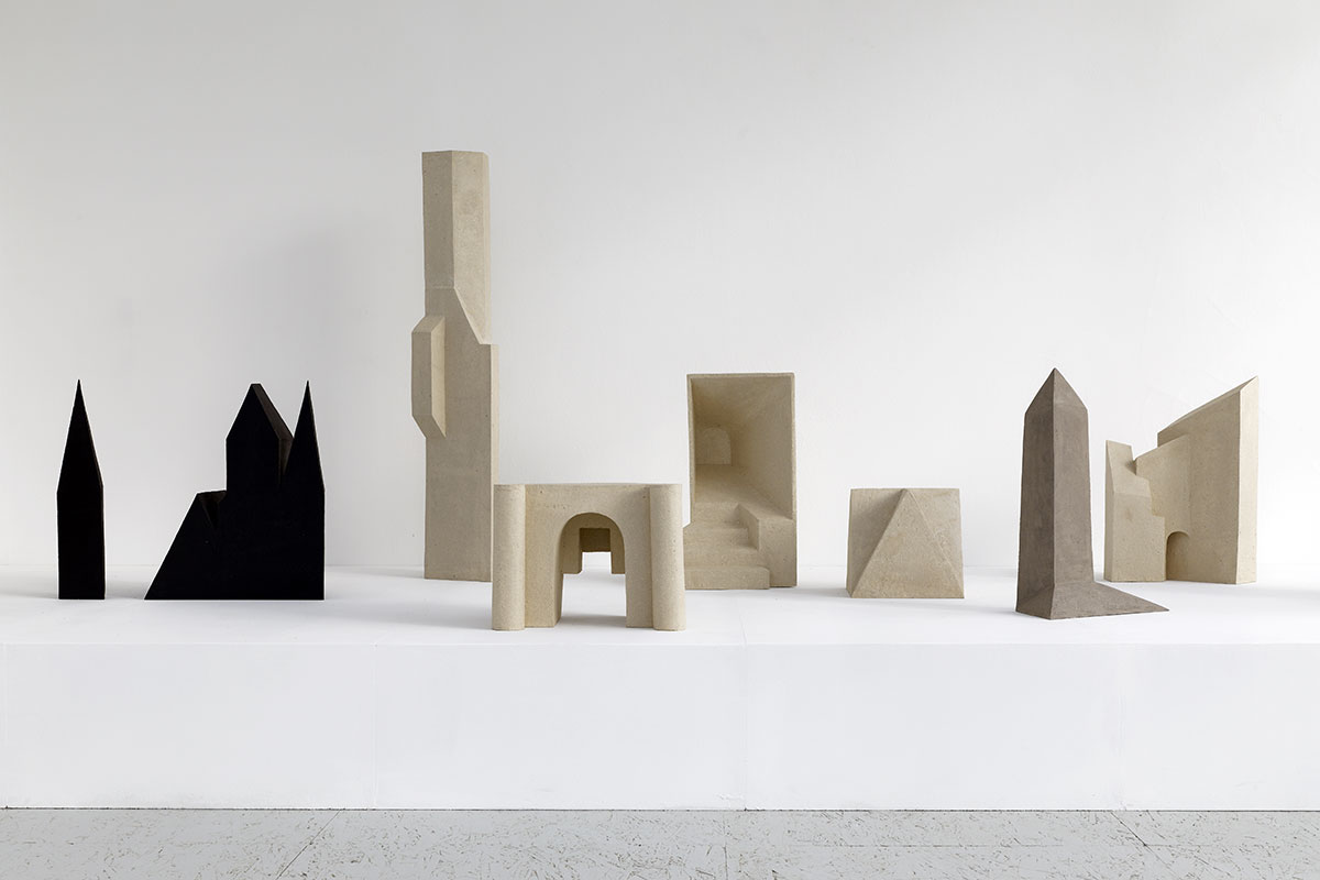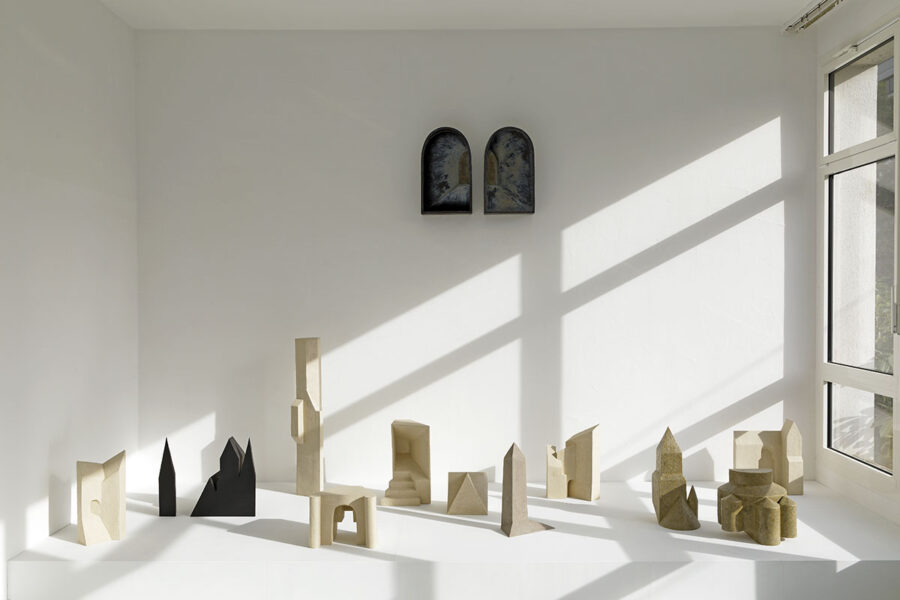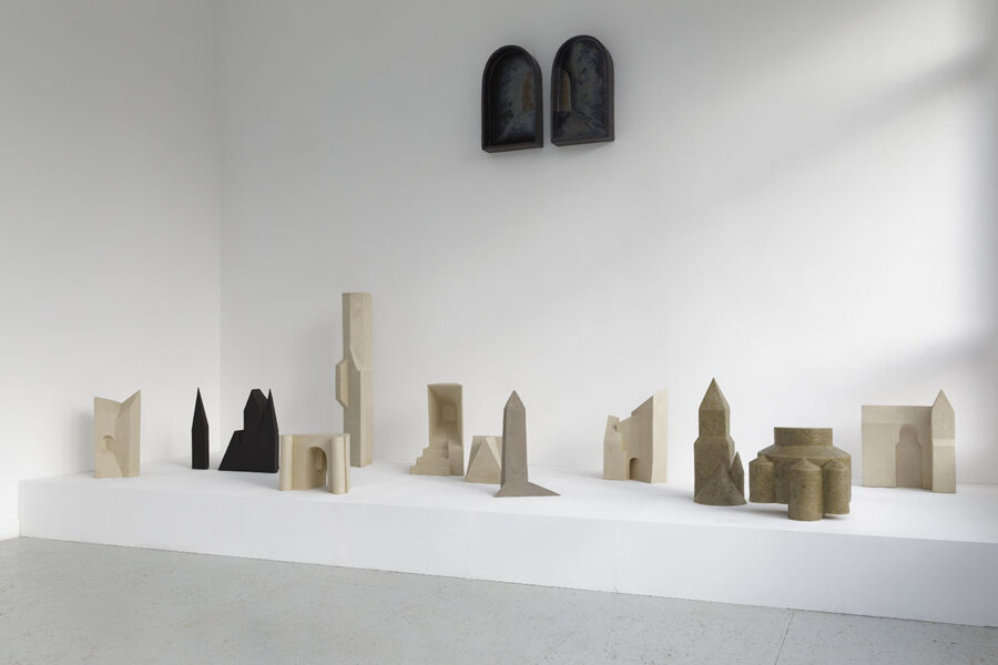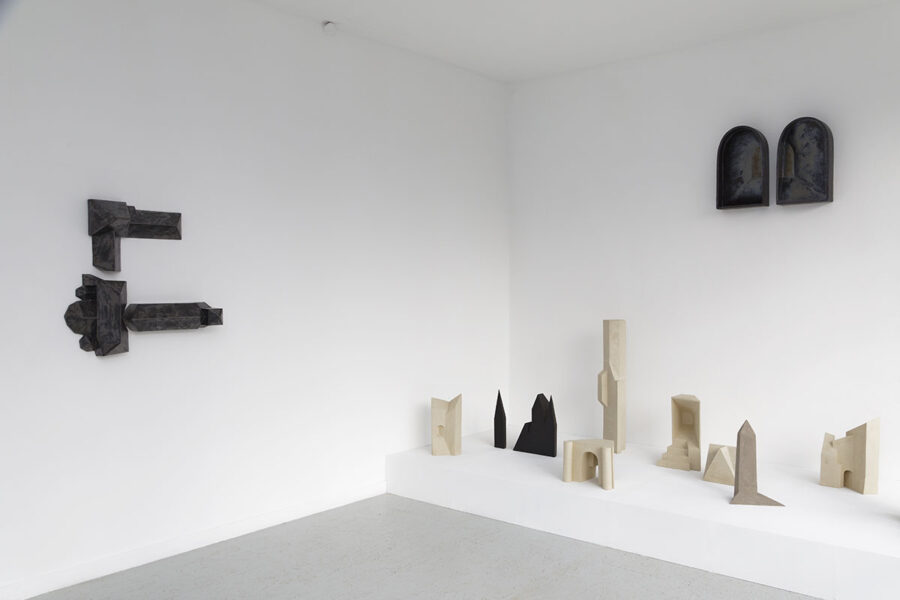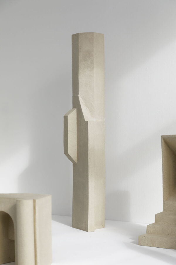 La pratique graphique d’Hélène Delépine alimente la conception de ses volumes en céramique. Le travail préparatoire consiste, pour elle, à exécuter des croquis sur place, en extérieur, face à des constructions. Ses dessins au trait, linéaires, constitués de lignes droites, horizontales, verticales ou diagonales révèlent une forme architecturale, le pourtour d’une façade, la forme d’un toit, d’une ouverture. Elle s’attache uniquement aux lignes de construction et aux proportions du monument sans relever aucun détail architectural. À partir de ces points de vue dessinés en perspective frontale ou cavalière, elle réalise des édifices en terre à une échelle réduite. Sculpter un matériau comme la pierre, c’est enlever de la matière à un bloc plein. En céramique, modeler l’argile, c’est ajouter de la matière au fur et à mesure que l’objet s’élève autour d’un vide. L’argile, grâce à sa plasticité, se malaxe et prend forme. Le fait que la terre, de consistance molle, une fois cuite, devienne aussi dure que la pierre intéresse Hélène Delépine. Cet aspect minéral la conduit à élaborer des volumes architecturaux de forme géométrique simple, façonnés avec des plaques de terre. Les dessins alimentent les lignes de structure et les proportions de la future sculpture. La sobriété des constructions est renforcée par une économie de détails et valorisée par le relief, la profondeur et la lumière. Le répertoire de formes architecturales ainsi créé incite à une réflexion autour du bâtiment banal ou patrimonial. Pour mieux révéler le réel, l’artiste en construit des formes abstraites.