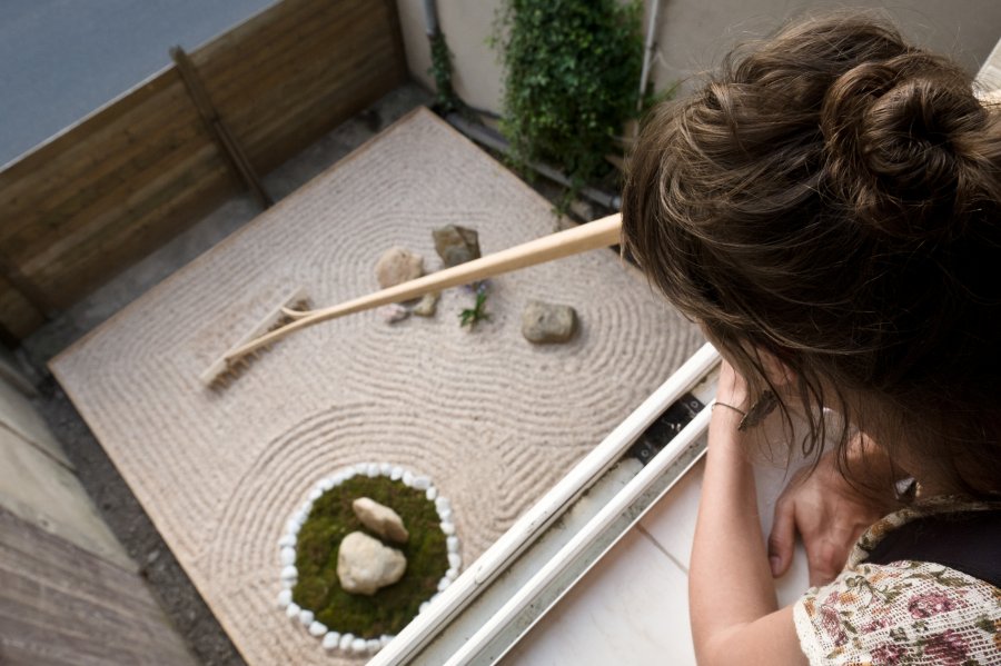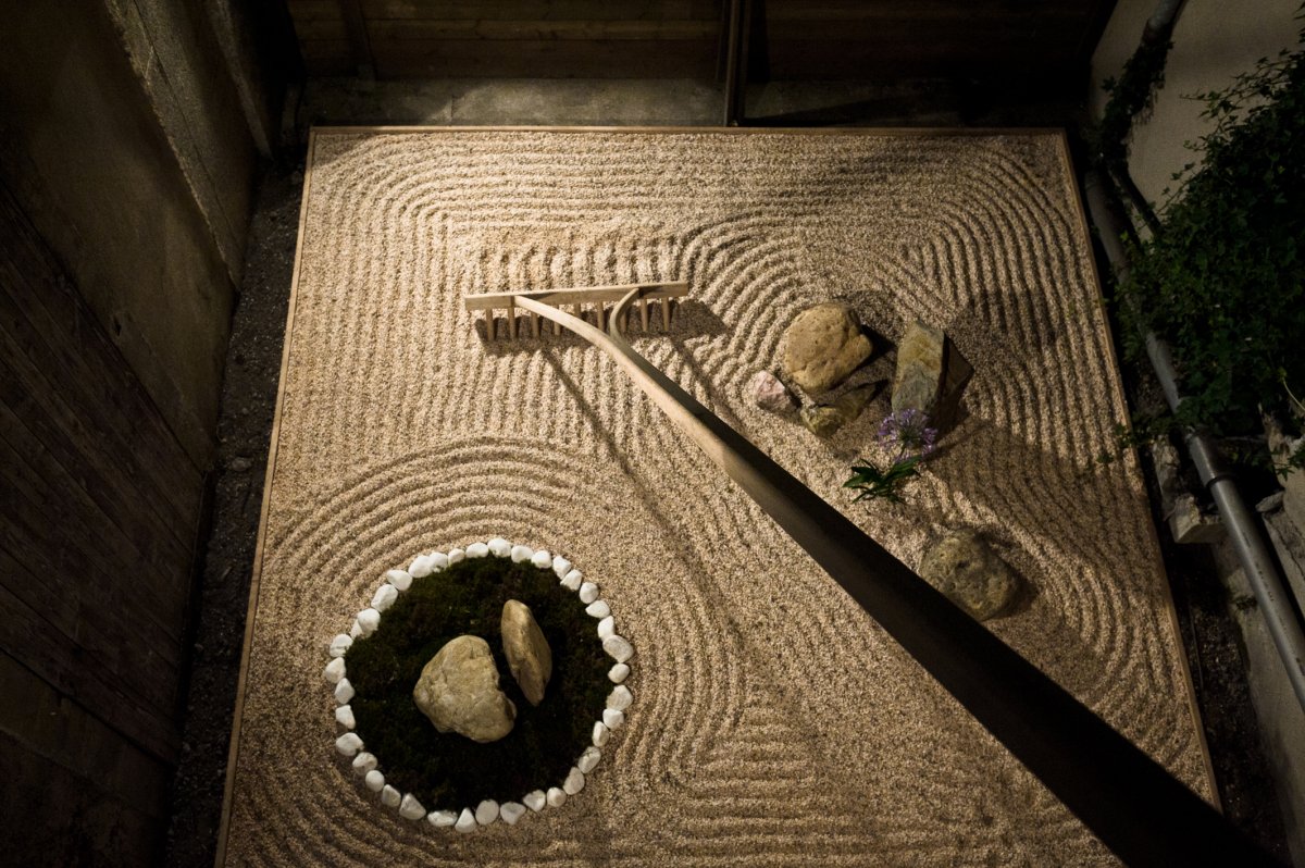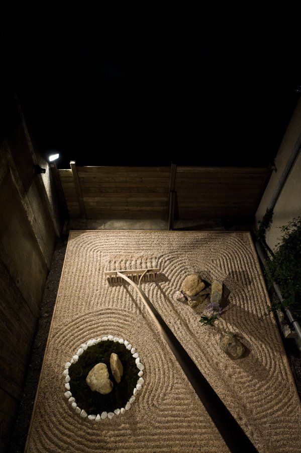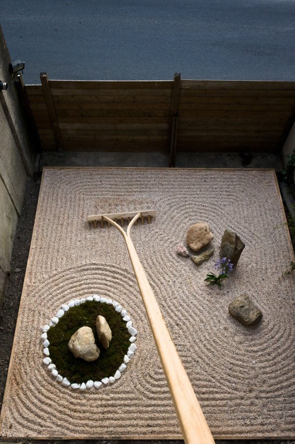 Il faut tout d’abord traverser la maison par un long couloir pour accéder à la salle de bain. A première vue, un manche sort de la fenêtre. En montant sur des marches pieds on découvre un long râteau ainsi qu’un jardin japonais en contre bas. En contradiction avec la vue, le site délabré et les voitures qui circulent, ce jardin sec appelle a être contemplé tel une composition. Jouant sur l’esthétique du jardin et ses stéréotypes, Coté jardin remet à l’échelle du lieu un jardin japonais miniature.