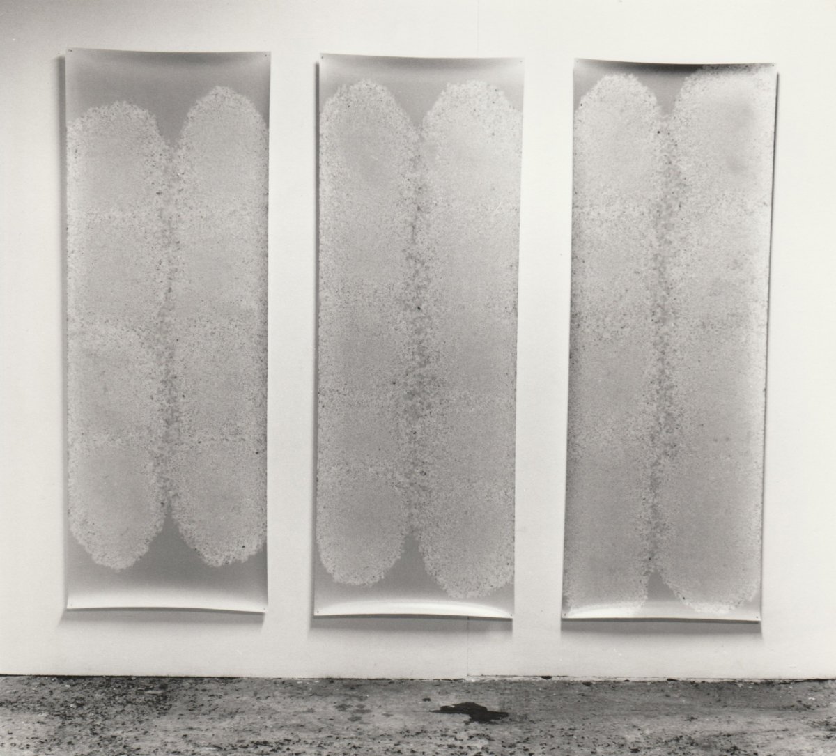 L’ensemble des oeuvres « Croisement » sont nés de la rencontre entre deux ou trois matériaux : sable coquillier ou fragments de pierre ou cheveux, et papier photographique grand format. Les Croisements sont issus de dispositif de production d’image sans appareil photo explorant les potentialités du photogramme1 et du contre-photogramme2.