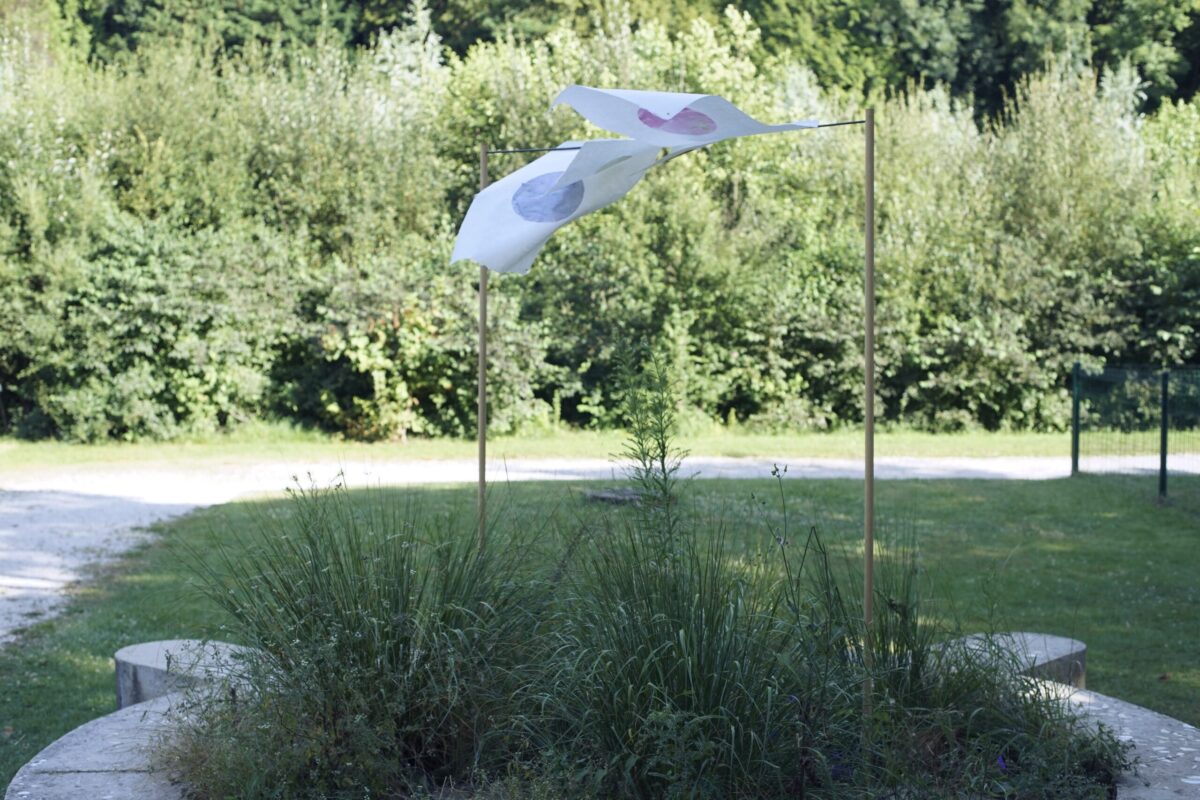 Ici, au Parc de l’Auzelou, l’espace a été renaturé, la végétation est dense : Viorne Aubier, Prunelier, Achillée Millefeuille, Onagre, Carotte, Bourdaine, Eupatoire, Cornouillier, Sureau,… Il en nait un nuancier étonnant, qui vibre et ondule, et se concentre en cercle sur le papier fin fabriqué par l’artisan papetier Jean-Pierre Gouy.