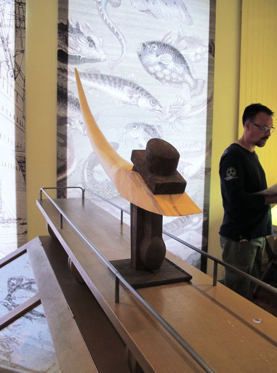 Cent fois plus gros que celui de l’humain, un globe oculaire de calamar géant accueille le visiteur alors il faut être à distance pour voir l’œil monstrueux dans toute sa mesure. L’inquiétant céphalopode semble trop à l’étroit dans un aquarium charmant.
