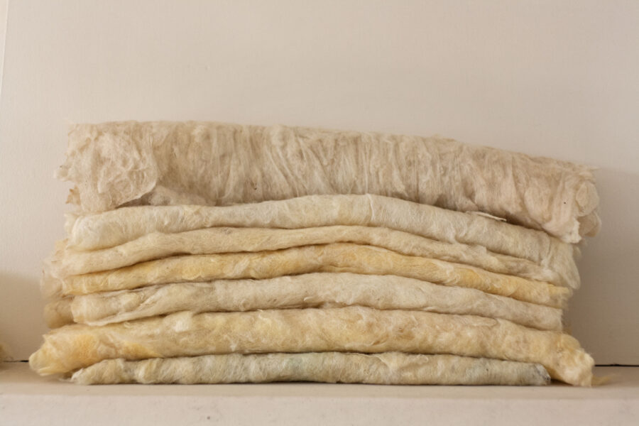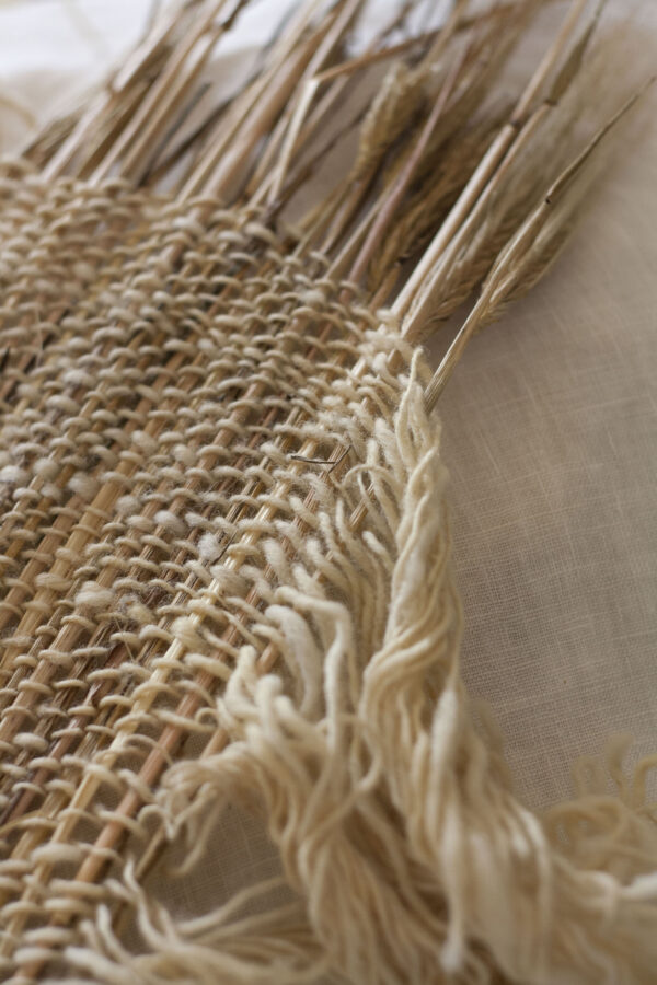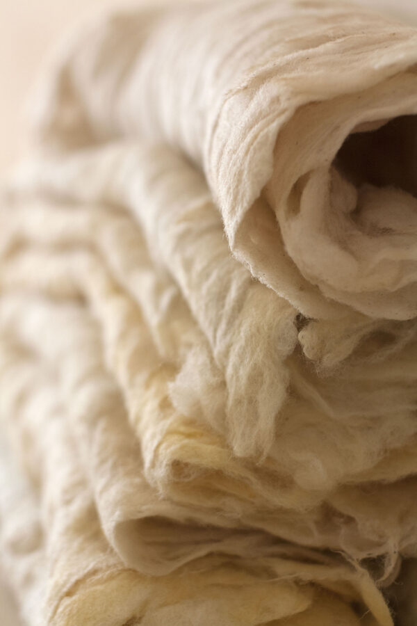 Aujourd’hui le prix de la laine ne permet pas aux éleveurs ovins de valoriser cette matière issue de la tonte de leurs bêtes. Nombre d’entre eux sont contraints de la vendre à perte, de la stocker pour une durée indéterminée, voir de l’enterrer ou de la brûler. Comment s’emparer de cette problématique à travers une recherche plastique et sensible autour de la transformation de cette matière ? Sur les images, différentes actions sur la matière, récupérée brute auprès de deux éleveurs en Allier : trier, laver, sécher, carder, feutrer, filer avec le rouet, ou encore tisser la laine de mouton. Il s’agit ici de laine de moutons Charollais, Texel et Île de France.