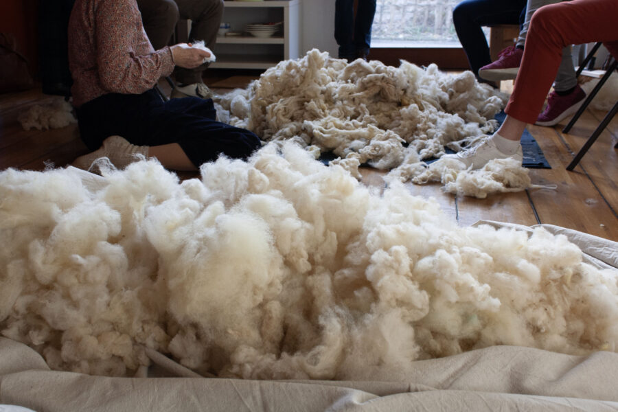 Ouverture d’atelier à la Maison de quartier Madeleine Champ de Mars à Nantes, janvier 2024. Avec un groupe de participant.e.s nous avons entrepris la réalisation d’un coussin géant en laine de mouton autour duquel se retrouver. Filer, carder, coudre, faire ensemble et se rencontrer autour d’une pièce collective.