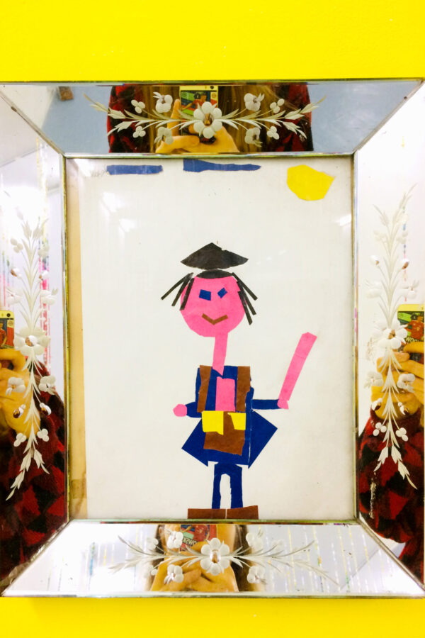 Sur le mur, le journal de curiosités, un ensemble d’éléments, petites choses, cadres, objets divers, mélange d’un journal intime et d’un cabinet de curiosités.